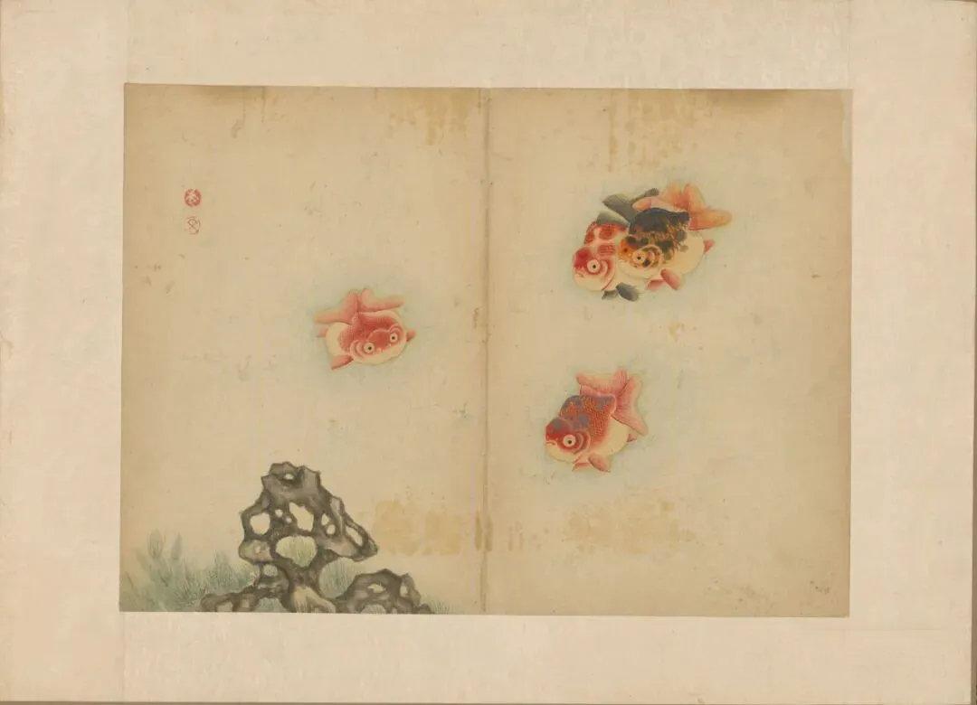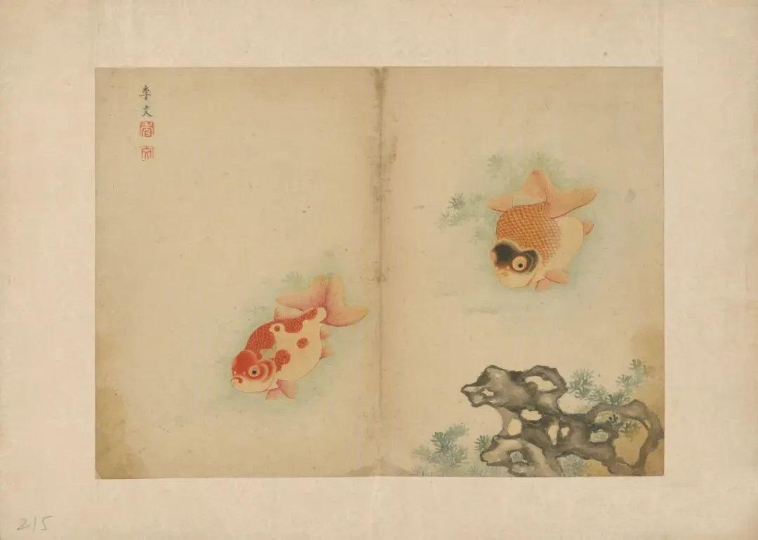 李文运用没骨技法,巧以色彩晕染。画中金鱼身形圆润,或独自畅游,或结伴而行,通过色