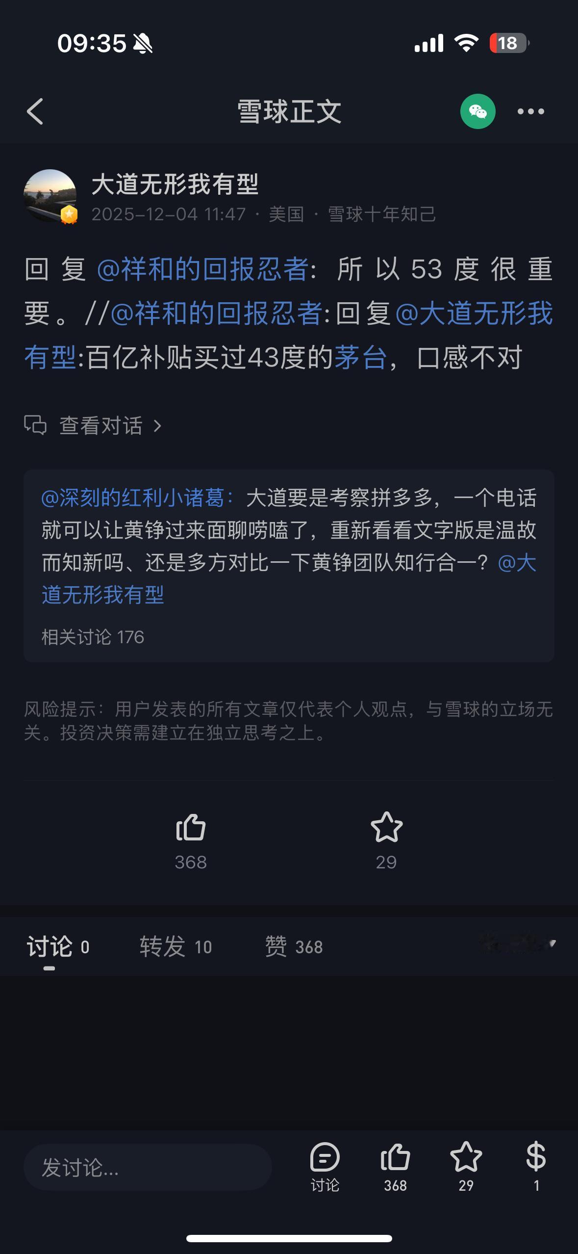 大道段永平点评茅台。 他在以自己的方式提醒茅台还是那个茅台。是一个可长期投资的公司。 当前特殊环境下导致白酒出现周期,其实思考下来,改变的只是周期,茅台的江湖地位第一没有改变。 周期的确会影响茅台的销售和创收,很多人花很大力气去研究猜测到底业绩会受损到什么样子,拿出渠道库存上亿瓶的逻辑。这些本身没有错,但想要预计到底对短期的销售产生多大的影响,其实就是犯了精确的错误的方法思考体系的错误。 我们要确保的是白酒作为消费品不会消失的,短期的气氛是周期扰动居多,茅台53的江湖地位无人撼动。有了这个底气,长期是可待的。 现在是1.8万亿的市值,长期茅台赚1500亿(5-10年)是可能的,除非你认为东边经济永远处在压力之下。 在这个1.8的位置值得关注[大笑]