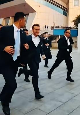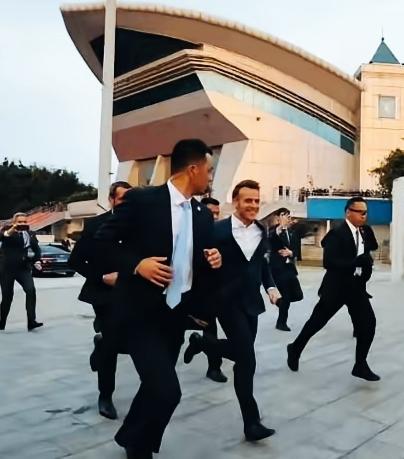 马克龙这姿势是不是很帅气啊! 这步伐迈的是不是铿锵有力啊? 这一下看出了,马克龙