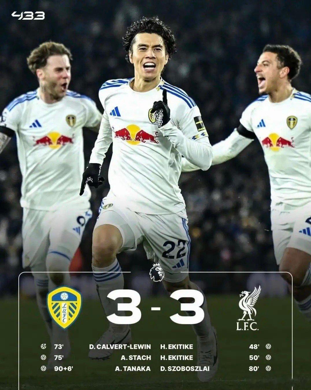 利兹联3比3利物浦激情互捅!英超第15轮,利物浦3-3战平利兹联;埃基蒂克双响建功,索博破门,田中碧补时绝平!