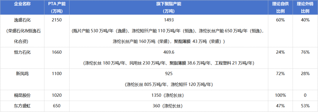 逸盛石化作为行业绝对龙头,今年以来对反内卷政策的反应最为积极,其通过长期停车检修,直接减少了PTA产量。据CCF数据,截至11月27日,逸盛石化旗下位于宁波、大连、海南基地的合计845万吨装置,已进入停车检修状态,开工率骤降至61.4%,堪称以一己之力拉低了行业整体开工率,以“自我限产”方式直接拉低行业负荷,成为本轮供给收缩的最大贡献者。据统计,其PTA产能约60%用于自供,40%用于外销。