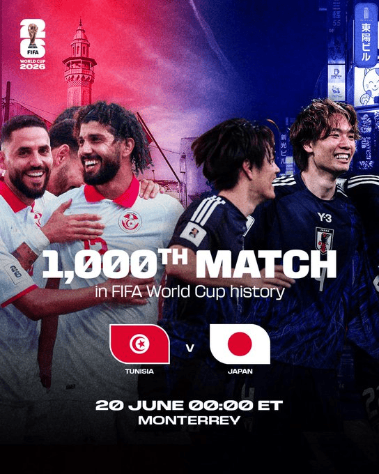 6月20日这场突尼斯对阵日本的比赛,将会是世界杯历史上第1000场赛事。
