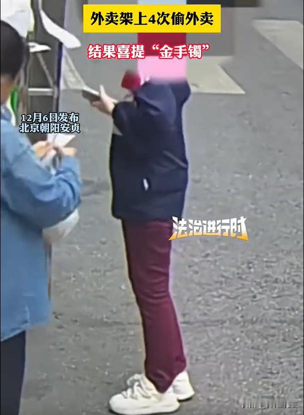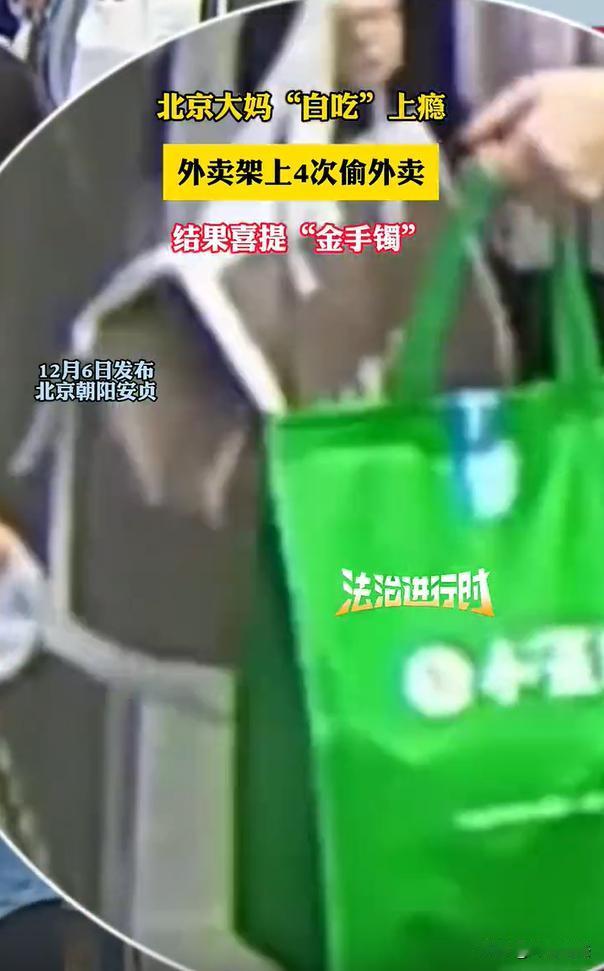 北京朝阳,一位大妈白吃白喝上瘾了,到了饭点就会溜达到自家楼下,货架上整齐的放置着各式各样的外卖,大妈选好餐之后,直接就给拎走、回家就全部吃光光。前后作案4次,终于被抓获。大妈尚未意识到事件的严重性,直到喜提一对“银手镯”,她才惊慌失措。 法治进行时12月6日报道了这则新闻。据报道称,小区里总是被投诉,业主点的外卖无缘无故的离奇失踪,外卖小哥也是一脸懵,自己明明都送达了,这外卖去哪了呢?一调查监控,才得知真相。 一位女子,今年也四五十岁了,一直单身在家。游手好闲的她,没有家庭,主打一人吃饱全家不饿。到了饭点呢,她也懒得做饭。 但是肚子总归要饿的,饿了该怎么办呢?就在前段时间,女子有了新思路,肚皮饿的很,就下楼去转一转,看看能不能有什么意外收获。 当时她还没走出小区,看到小区大门口有一处外卖货架。大概在中午11点的时候,就可以看到很多外卖员来来往往,直接就把外卖餐点放在货架上。 “好香啊~饭菜香扑鼻而来。”看到这些外卖,女子非常心动,要知道,这里面全是好吃的啊。女子心想:“如果我可以带走这些外卖,都不用自己做饭,直接能吃上热火菜了呢!” 心动不如行动啊,正想着呢,女子还真不自觉,直接就走到货架旁边,拿起一个外卖包裹就径直离去。 回到家之后,打开外卖包装,果真,饭菜香直接冲刺自己的天棱盖。女子开心的很,大快朵颐的开整。三下五除二,这份外卖就被她吃的干干净净。 今天的伙食算是解决了,但是吃完这顿还有下顿呐!作案上瘾之后,女子又准备对货架上的外卖下手。就这样,一来二往,她白吃白喝了有四顿。 而货架上的外卖不断丢失,这可让业主还有骑手犯难了。业主先投诉到店家:你们怎么还不给我出餐啊? 店家也很无辜,又投诉到骑手这边:你们怎么还不送餐啊? 最后,骑手一脸茫然:我都亲自送到货架上了啊,还有拍照片啊。骑手直接就把自己送达之后餐点照片发给了业主,最后无奈只能拨打110来解决。 调查监控之后发现,货架上的餐点,确实不是无缘无故的消失,画面显示,一位大妈不断过来偷外卖,前后大概过来偷取了4趟。 这下真相大白,问了物业,很快就摸索到这位大妈的家。进门之后,大妈还很无辜呢,不过证据确凿,她也只能承认,确实,外卖就是她偷的。 最后,这位大妈被工作人员带走,喜提一对“银手镯”,这下,里面也可以给她管饭了...... 大妈前后4次偷拿外卖,回家之后吃的干干净净,她的这个行为触犯哪条法规呢?将会面临怎样的处罚?偷取外卖的行为是否构成“多次盗窃”? 第一,大妈的行为触犯刑法,将会被判刑。 根据《刑法》第二百六十四条规定,多次盗窃通常会被处以三年以下有期徒刑、拘役或者管制,并且还会被单处罚金。如果存在主动退赃、并且获得谅解,则可能会被量刑从轻。 从本案来看,这位大妈的行为已经构成了盗窃罪,并且触犯刑法。 本以为自己作案无人知晓,连续4次前往外卖柜去“零元购”,偷窃别人的餐点,符合多次盗窃的标准,不管她作案的金额是多少,她都需要被追究刑事责任。 另外,女子最后已经将餐点全都吃的精光,因此不存在积极退赃的情况,她只能面临严厉的法律惩处。 第二,大妈的行为符合多次盗窃的标准,将会被刑事立案。 根据《刑法》规定,两年内盗窃三次以上,则构成“多次盗窃”,而且跟涉案金额无关,会被直接立案惩处。刑期一般在三年以下、拘役或者管制,还要被处以罚金。 由本案来看,大妈连续作案,前后4次前往外卖柜偷拿别人的餐点,这个行为已经构成了“多次作案”,多次盗窃,这个行为是需要被严厉判决的。 两年内盗窃三次就会入刑,大妈偷拿外卖的行为,即便外卖不值钱,但是已经达到了立案标准,符合严厉判决的条件。“偷吃一嘴油”,大妈终究要为自己的行为负责。 看完本案之后,深知一点:不法行为不可为。对此,大家都如何看待呢?