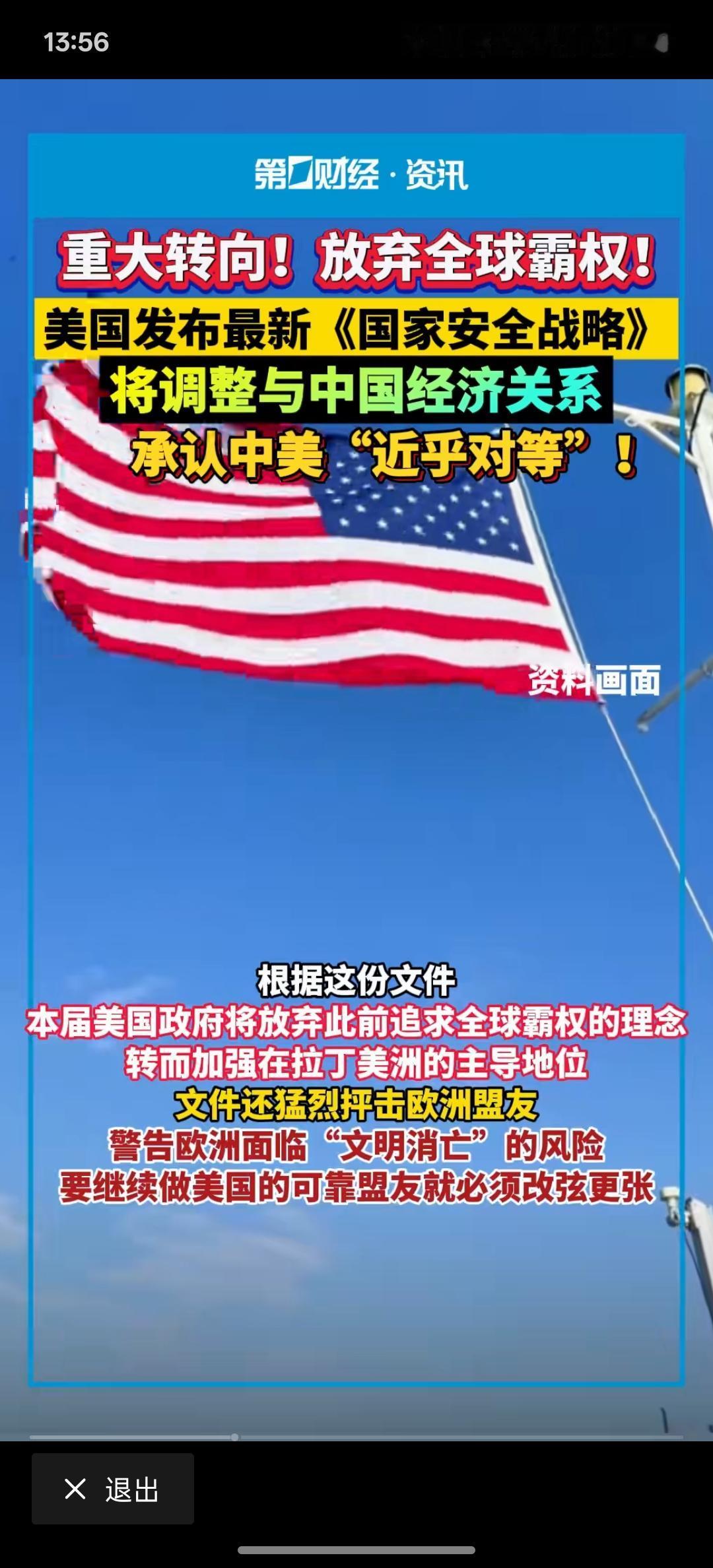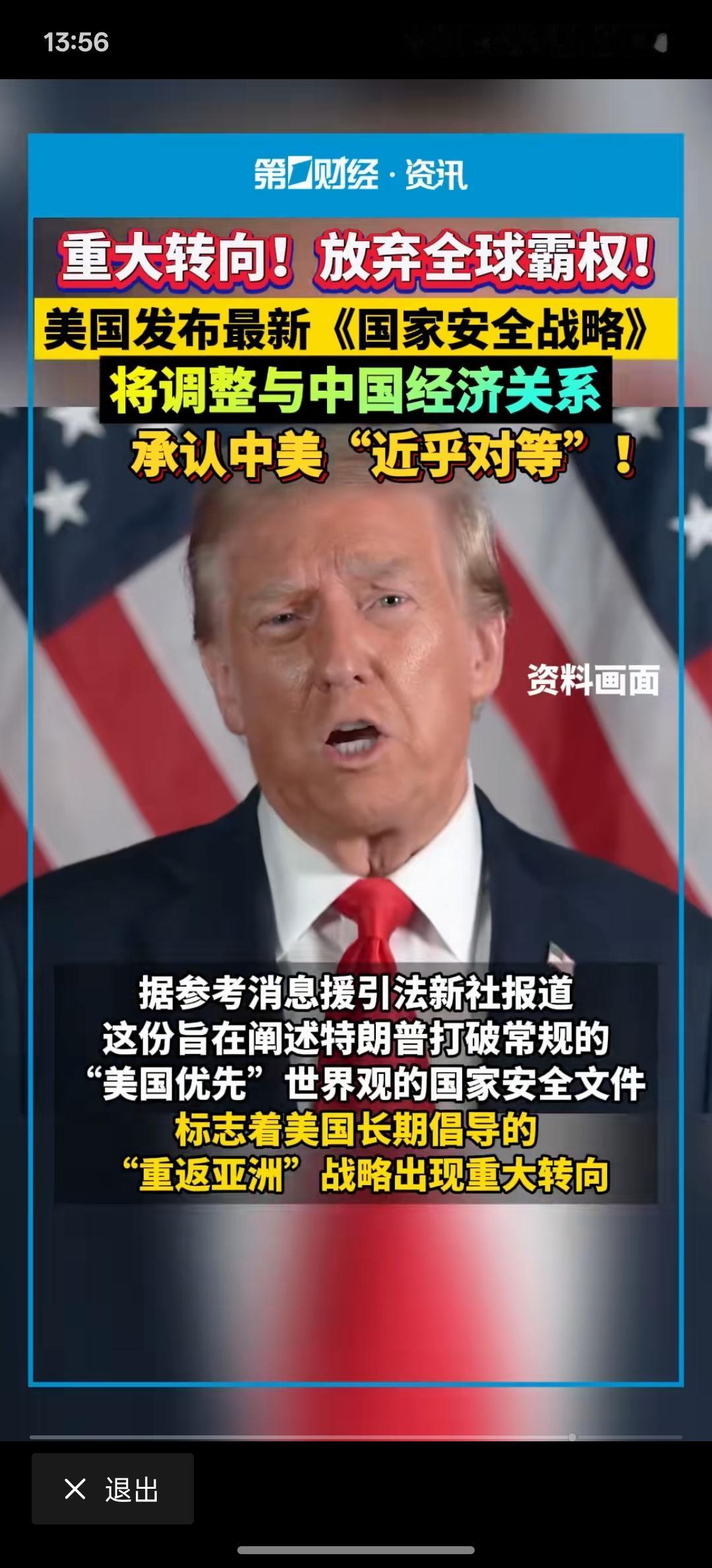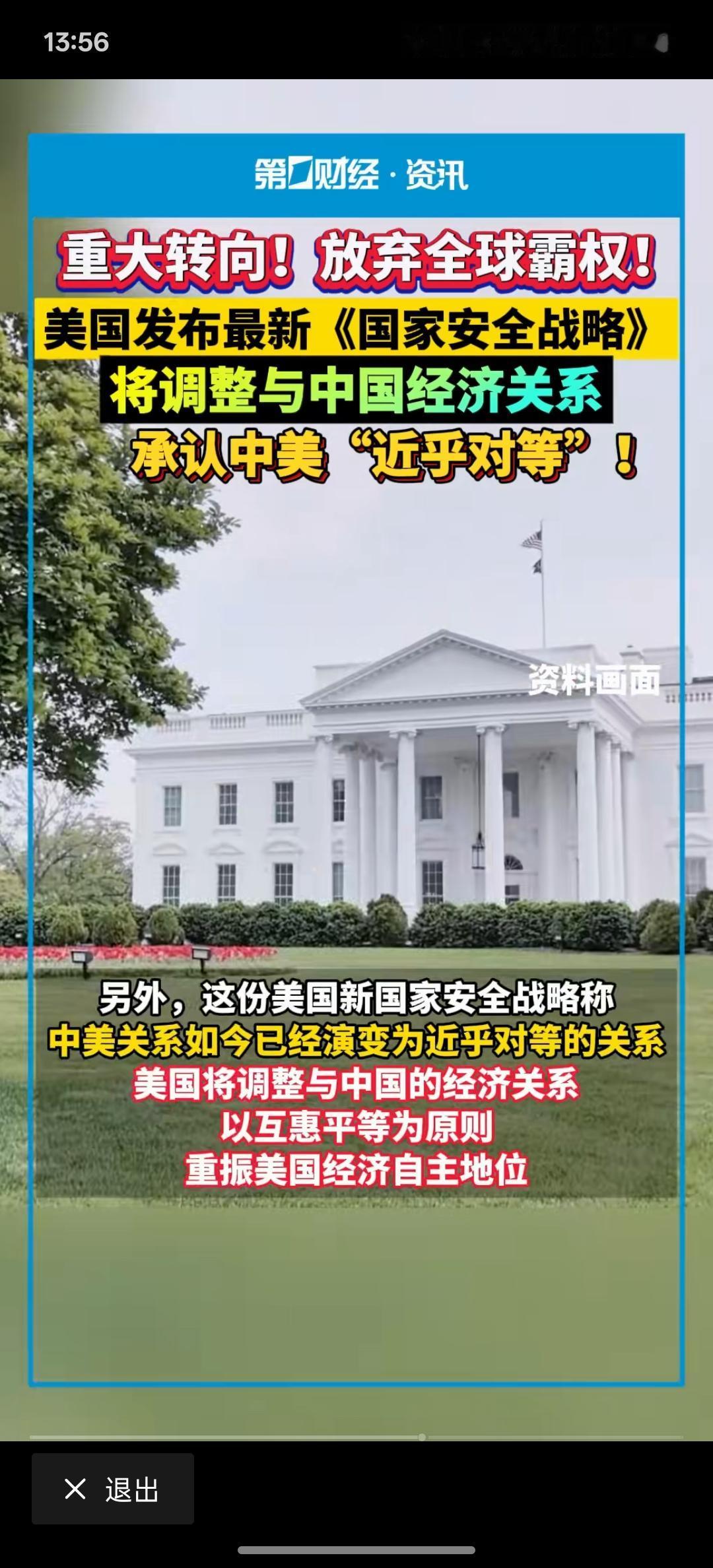 中国股市接下来可以放心的上涨,美国的重大战略政策突然转向,美国将放弃全球霸权,美国发表部新的国家安全战略!将调整与中国的经济关系!承认中美“近乎对等”!根据美国目前发布的这份国家安全战略报告来看的话,美国之前说重返亚洲地区这个战略应该也会产生重大转向!那未来在亚洲地区绝对是中国经济版图,重要的发展区!中国对东盟的一带一路以及重要的经济体进行了大规模的合作,而且中国对东盟的出口远超于美国与欧洲!欧洲经济确实在衰退,尤其是俄乌战争过后,欧洲经济将出现重大的发展压力,毕竟廉价能源已经没有了,欧洲未来将承受高昂的制造成本!美国看得非常清楚,欧洲的文明正在有消亡的风险! 现在来看中国,中国现在各方面的发展,而且都超出了欧洲发展!不管是从汽车工业还是能源改革,还是制造业,还是科技创新,都远超于欧洲的发展!