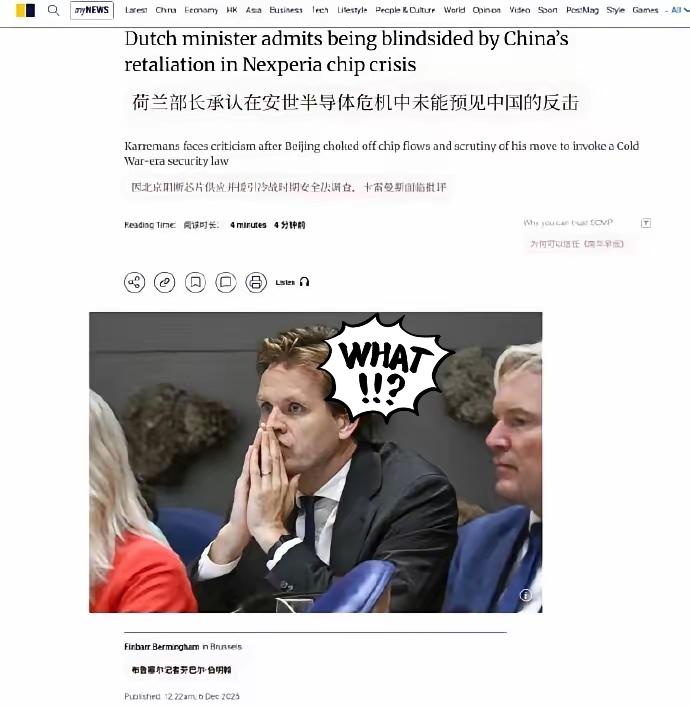 “我们没有想到中国会反击!” 瞧瞧卡雷曼斯这话说得: “这是一个经过深思熟虑且有充分依据的决定。我们评估了所有风险和信息,并做出了谨慎的权衡。我们预料到中国可能会采取反制措施,但我们没想到中国会对安世半导体中国工厂生产的芯片实施出口限制。” 卡雷曼斯这番委屈巴巴的表态,像极了做坏事被抓包还喊冤的小孩。要知道,这场芯片领域的博弈,本就是他们先掀的桌子。此前相关方面打着“国家安全”的幌子,对中国半导体产业搞各种限制,又是技术封锁又是市场壁垒,算盘打得隔着太平洋都能听见响。他们笃定中国会忍气吞声,顶多做点不痛不痒的回应,毕竟在他们的固有认知里,中国向来“以和为贵”,不会轻易动用反制利器。 安世半导体的情况更是耐人寻味。这家企业的中国工厂掌握着不少成熟制程芯片的产能,而这些芯片广泛应用在汽车电子、消费电器等领域,是不少欧美企业供应链上的关键一环。他们只想着用这家企业的技术和产能赚中国的钱,却没想过中国手握其在华生产的主动权。当出口限制的政策落地,那些依赖安世芯片的海外厂商瞬间慌了神,订单交付延迟、生产线停摆的风险直接砸在头上,这才让卡雷曼斯们慌了手脚。 说到底,他们的“没想到”,本质是骨子里的傲慢和对中国实力的误判。这些年西方在科技领域的霸权思维已经根深蒂固,总觉得自己能拿捏住产业链的命脉,中国只能被动接受他们定下的规则。他们所谓的“谨慎权衡”,不过是站在自己的利益角度盘算,压根没把中国的反制决心和能力算进去。 更可笑的是他们口中的“暗示”。在国际博弈的舞台上,从来不是靠眼神和暗示就能定输赢的。中国的处事逻辑向来是先礼后兵,你敬我一尺我敬你一丈,但要是蹬鼻子上脸突破底线,那必然会迎来雷霆反击。他们看不懂中国的“王牌”,不是因为中国藏得深,而是他们被傲慢蒙住了眼,既低估了中国维护自身权益的决心,也高估了自己在产业链中的不可替代性。 如今的芯片江湖早就不是西方一家独大的局面,中国在成熟制程领域的产能和技术储备,早已成为不容忽视的力量。卡雷曼斯的“没想到”,不过是给所有想在科技领域搞霸权的势力提了个醒:时代变了,想靠打压遏制中国发展,最终只会搬起石头砸自己的脚。 各位读者你们怎么看?欢迎在评论区讨论。