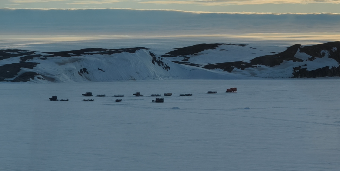 中山站位于普里兹湾的东南沿岸。考察队向中山站运送物资,需驾驶科考船尽可能接近中山站,再通过冰上运输或直升机运输完成卸货。其中,冰上运输俗称“海冰卸货”,即把货物放在雪橇上,再用雪地车拉着雪橇穿过海冰送到中山站。