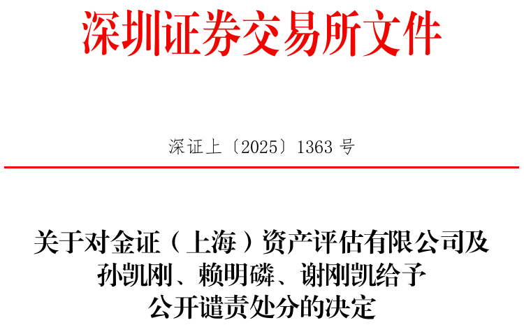 经查,金证评估、孙凯刚、赖明磷、谢刚凯在对中科君达视界技术股份有限公司(中科视界)的股东全部权益价值进行评估过程中,存在以下违规行为:对主要客户及订单核查验证工作执行不到位;未对盈利预测的关键支撑材料进行必要的核查验证;评估过程中未保持充分的独立性;未记录其他权益投资价值评定估算过程;评估结论形成日早于重要评估资料获取日,深交所决定对金证评估、孙凯刚、赖明磷、谢刚凯给予公开谴责的处分。