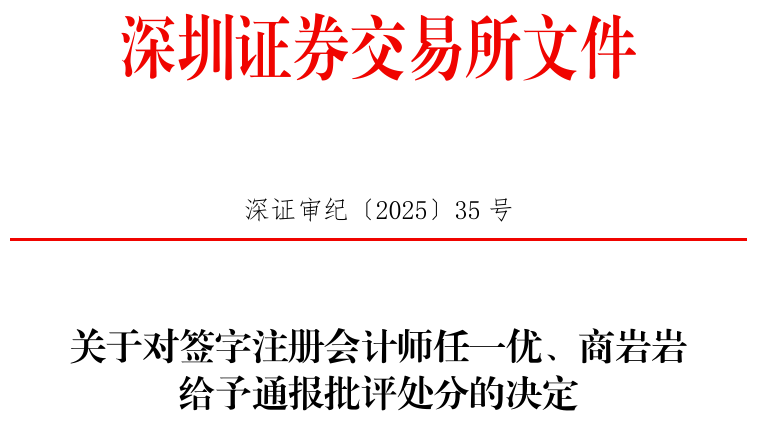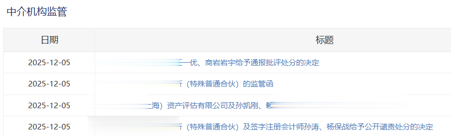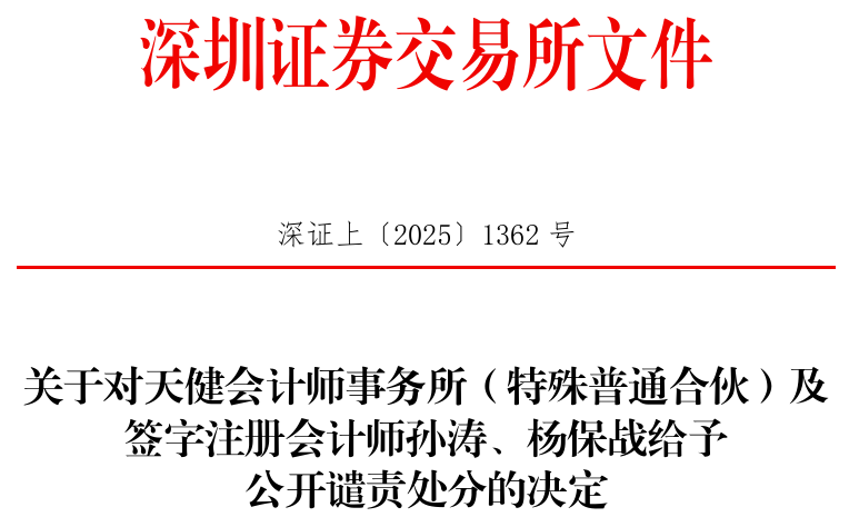 12月5日,深交所官网公布了对天健会计师事务所、孙涛、杨保战给予公开谴责处分的决定;对金证(上海)资产评估有限公司、孙凯刚、赖明磷、谢刚凯给予公开谴责处分的决定;对致同会计师事务所的监管函及对签字注册会计师任一优、商岩岩给予通报批评处分的决定。