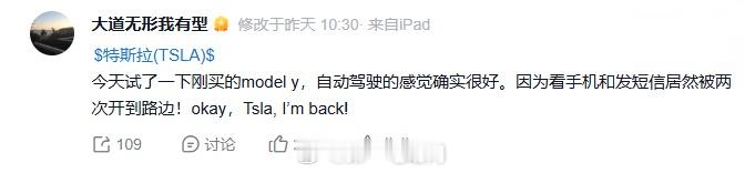 知名投资人段永平6日在社交平台雪球发文,透露其近期购入一辆特斯拉Model Y,在试驾过程中自动驾驶的体验“确实很好”,但因自己在途中看手机和发短信,居然两次被车辆系统强制接管并开到路边停车。他还写道:“Okay, Tesla, I'm back!”,暗示其对特斯拉的重新认可。曾表示“觉得埃隆・马斯克这个人是厉害,他有很多想法也确实是很先进,但是投资我觉得我比较难,个人的角度来讲,我不是很喜欢这个人的品行,你投资实际上你在跟他做朋友,我不想跟他做朋友,哪怕给我钱我也不干” 特斯拉ModelY自动驾驶