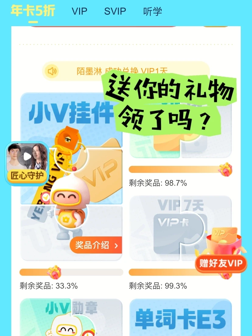 到时候这些卡,就会及时的发放到指定开通的账号了!之前都没有遇到过这样的情况~又继续给他充了一年的VIP,希望孩子的成绩一直都能够缓慢的提高吧。