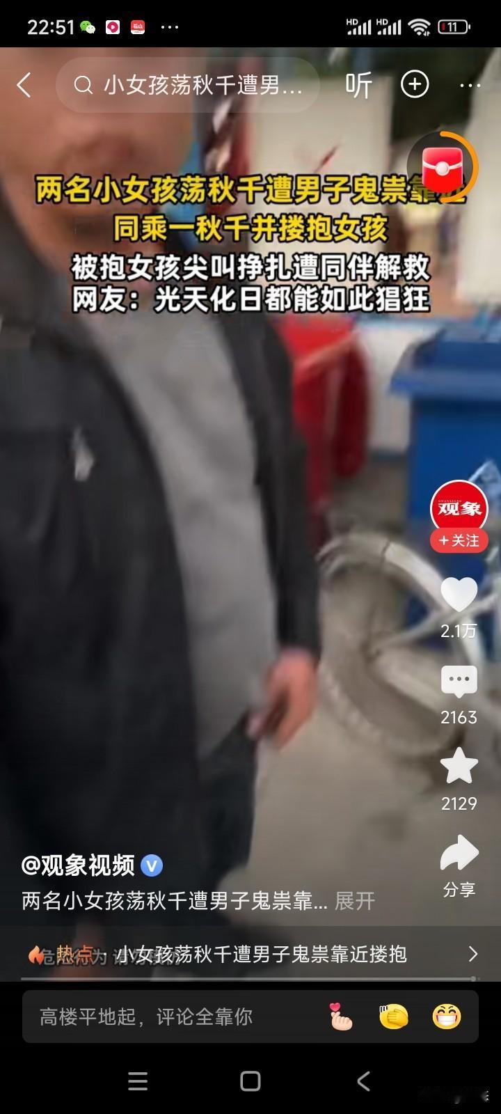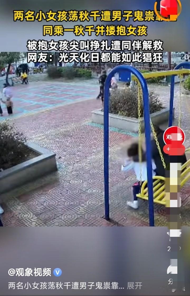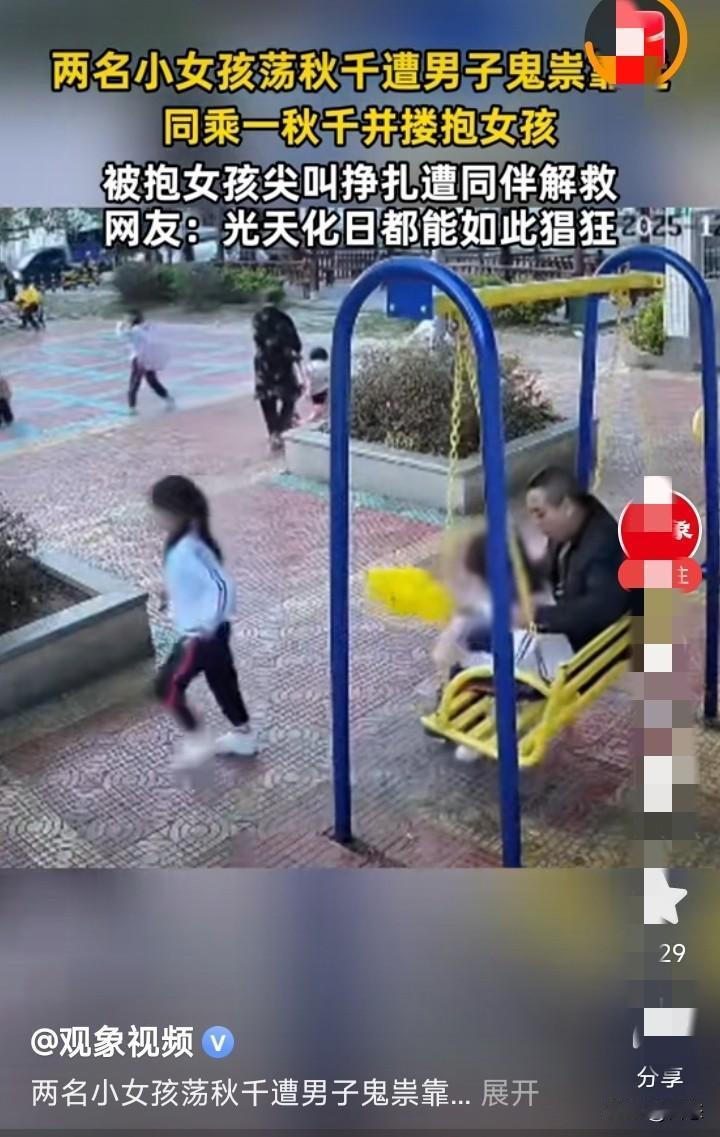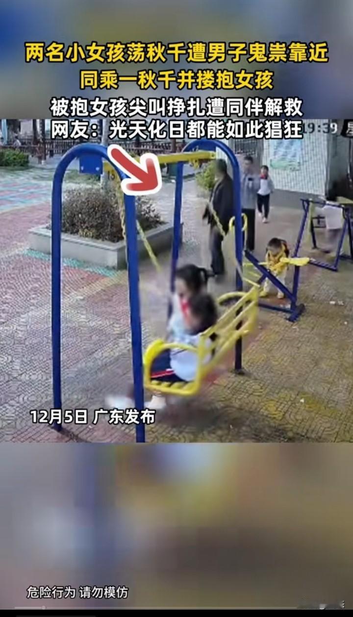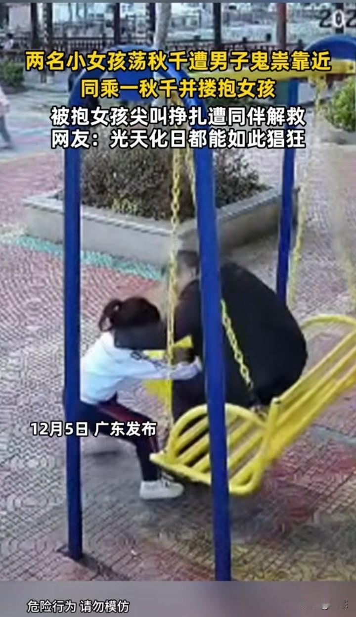 广东两个小女孩在荡秋千,没想到一男子鬼鬼祟祟的靠近两个小女孩,男子坐上去想对女孩进行猥亵,女孩拼命的叫喊,一女孩见状就躲开了, 男子看女孩不听使唤,同行的女孩也过了帮忙,女孩就挣脱了。 随后男子被路人抓住,报警带走了。 想想都后怕,要是没人看见,后果不堪设想啊!男子居然在光天化日之下进行猥亵,估计不是首犯,希望严惩不贷。 在里面提醒一下,家长一定要多灌输一些安全知识,遇到坏人怎么办,不要让孩子离开自己的视线,特别是小女孩。 世界那么大,什么人都有,以防万一! 你们怎么看这种人呢?小孩子都不放过!