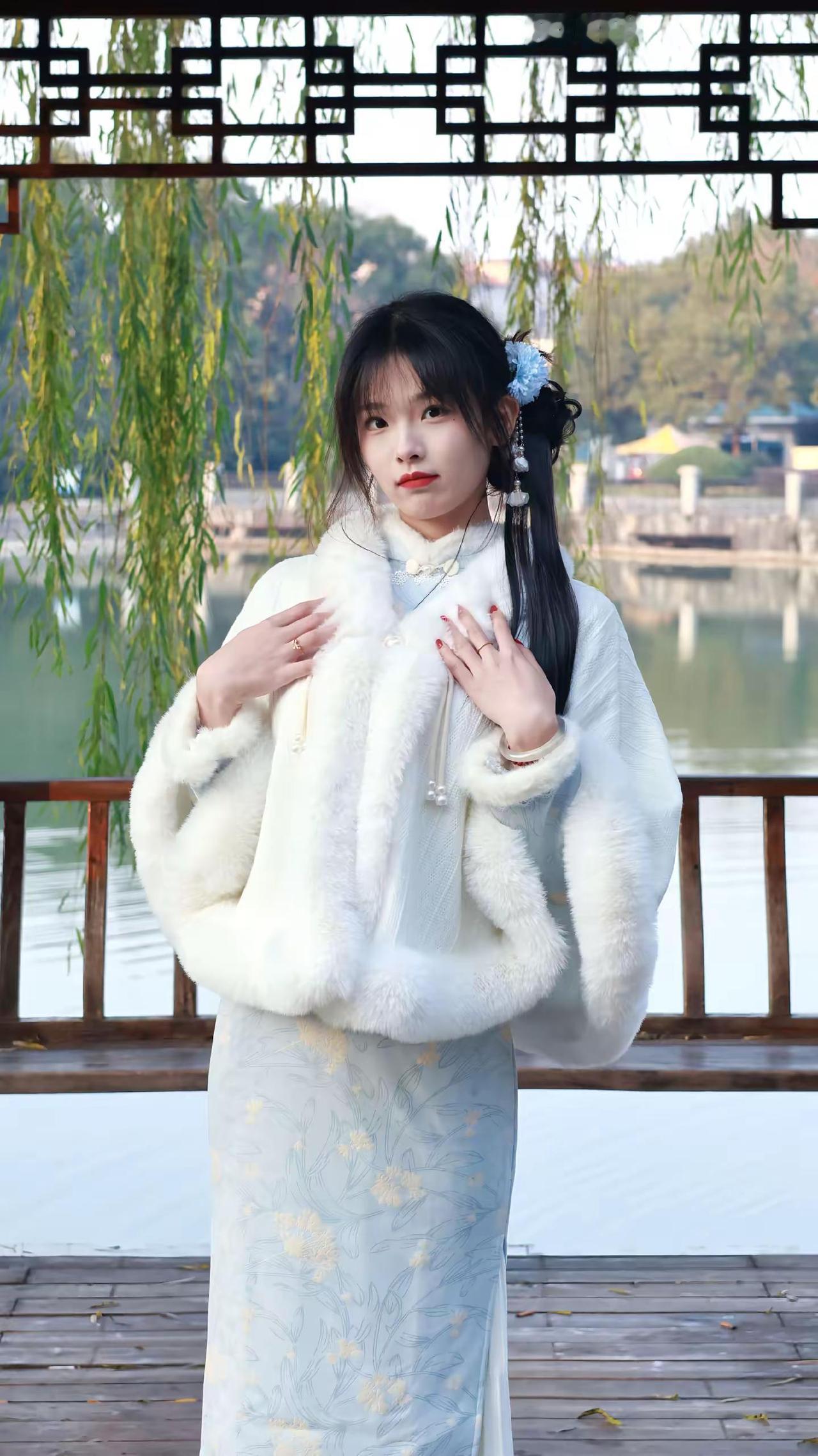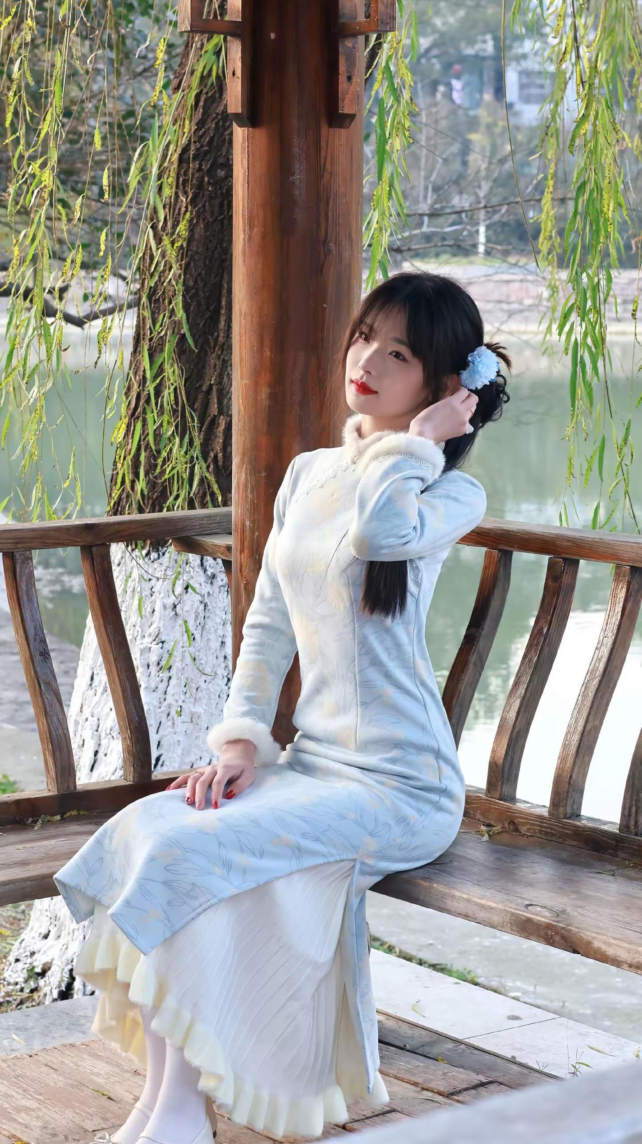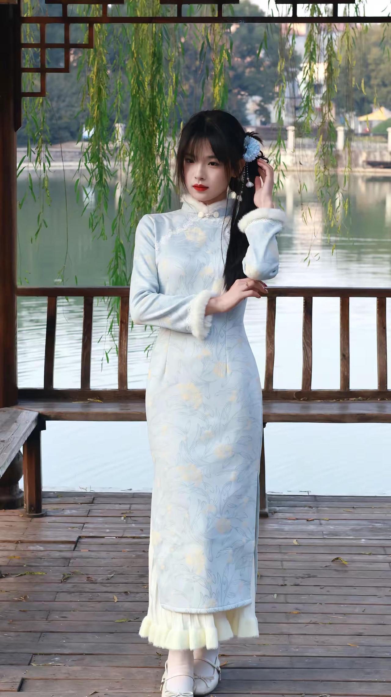 温柔古典美人,浅蓝旗袍,优雅气质,梦回古代