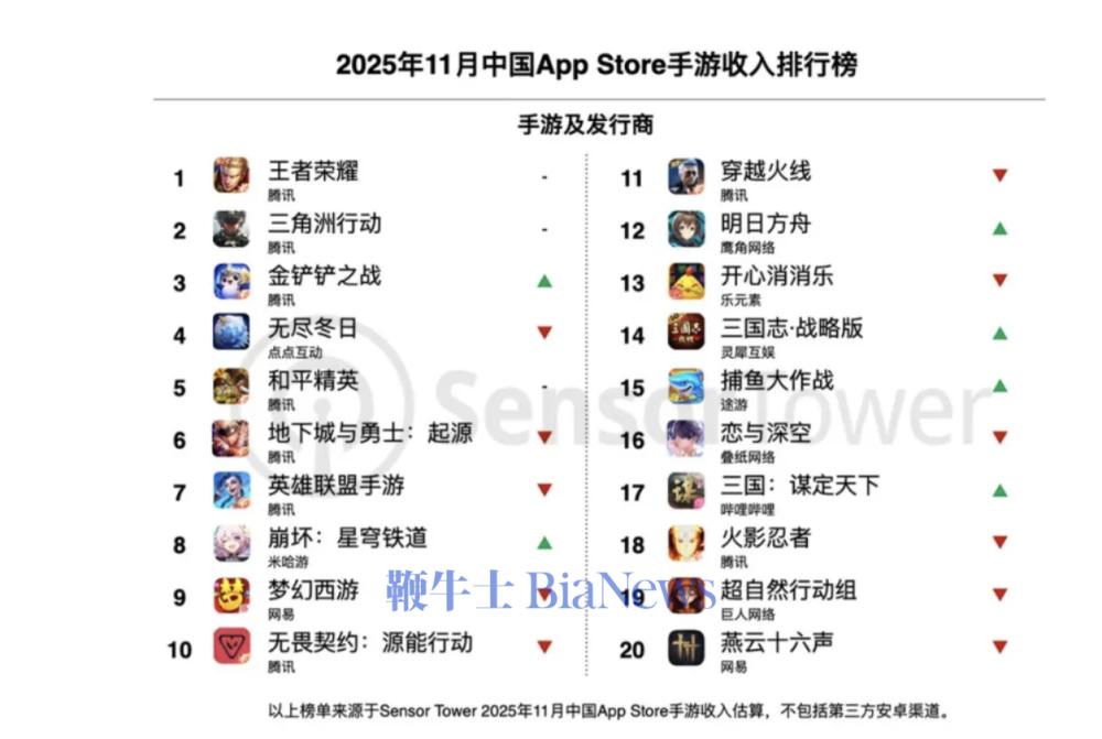 11月中国AppStore手游收入排行榜中,腾讯《王者荣耀》、《三角洲行动》蝉联榜单冠亚军。