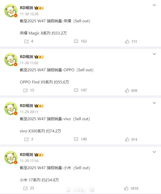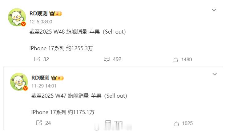 小米17系列依然第一,最牛的肯定是iPhone 17系列1、小米17系列累计销量达到244.1万台,W48周的销量为9.3万台;2、vivo X300系列的累计销量为80.32万台,W48周的销量为6.12万台;3、OPPO Find X9系列的累计销量为60.4万台,W48周的销量为4.8万台;4、荣耀Magic8系列的累计销量为36.3万台,W48周的销量为3.1万台;5、iPhone 17系列累计销量已经高达1255.3万台,W48周的销量为80.2万台。PS:iPhone 17系列一周的销量等于vivo X300系列累计的量,超过OPPO Find X9系列累计销量,更是荣耀Magic8系列累计销量的两倍多。