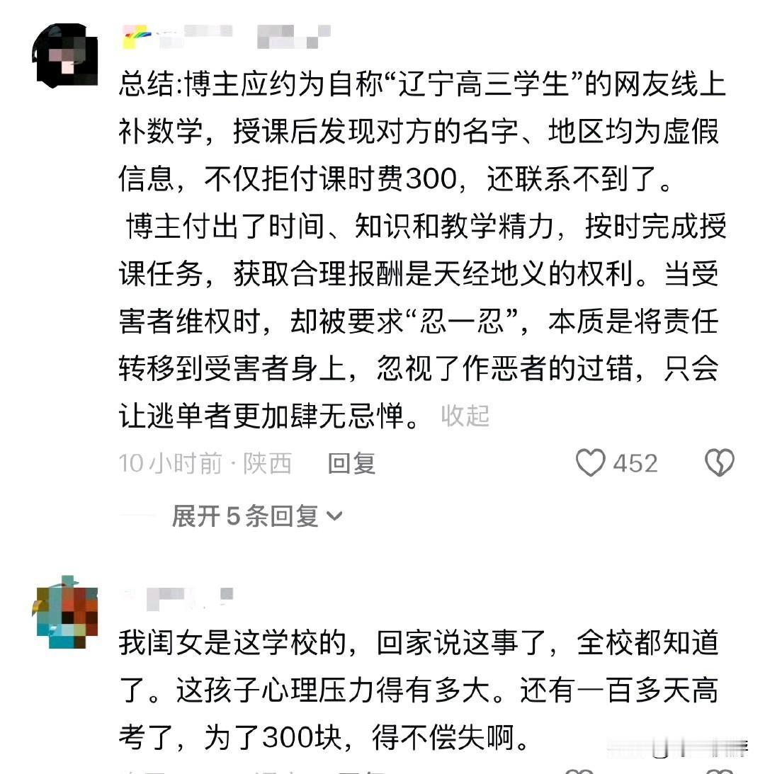 清华学生补课,课时费只要300,本身就挺便宜的了,没想到还被白嫖了。 咱就说这清华学霸郭恩惠格局是真打开了!被白嫖300块家教费,人非但没曝光学生信息,还就想要个道歉。 人家从北大退学又考上清华,实力摆这儿,结果遇上这糟心事儿。 但话说回来,这家长和学生也太不地道了,300块钱不多,可诚信和尊重不能少啊! 目前这个博主已经通过试卷找到了这位高三学生的学校。据评论说,现在全校都知道了,临近高考之际出了这事,这位考生心理压力估计很大,真是得不偿失……