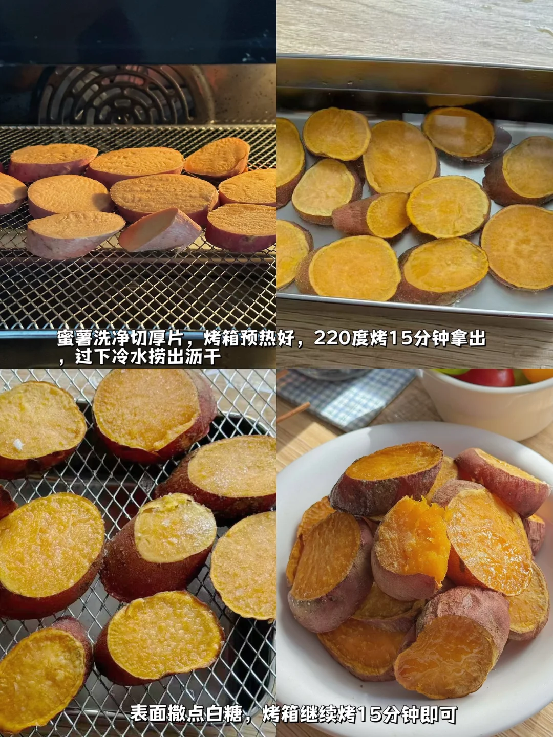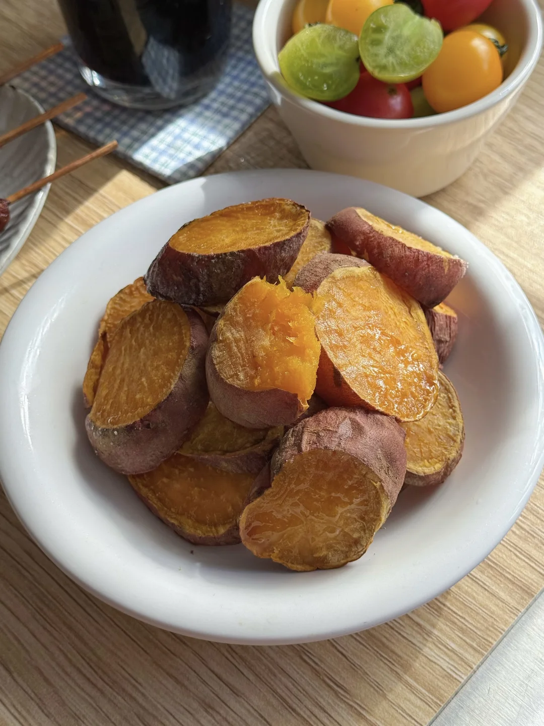 红薯选了蜜薯,切匀厚片,用烤箱高温烘烤。边缘慢慢卷起,泛起焦糖色,咬下去中间绵密香甜,表面则有点脆韧。这份质朴的甜,正好衬馄饨汤的咸鲜——咸甜永动,搭配默契。