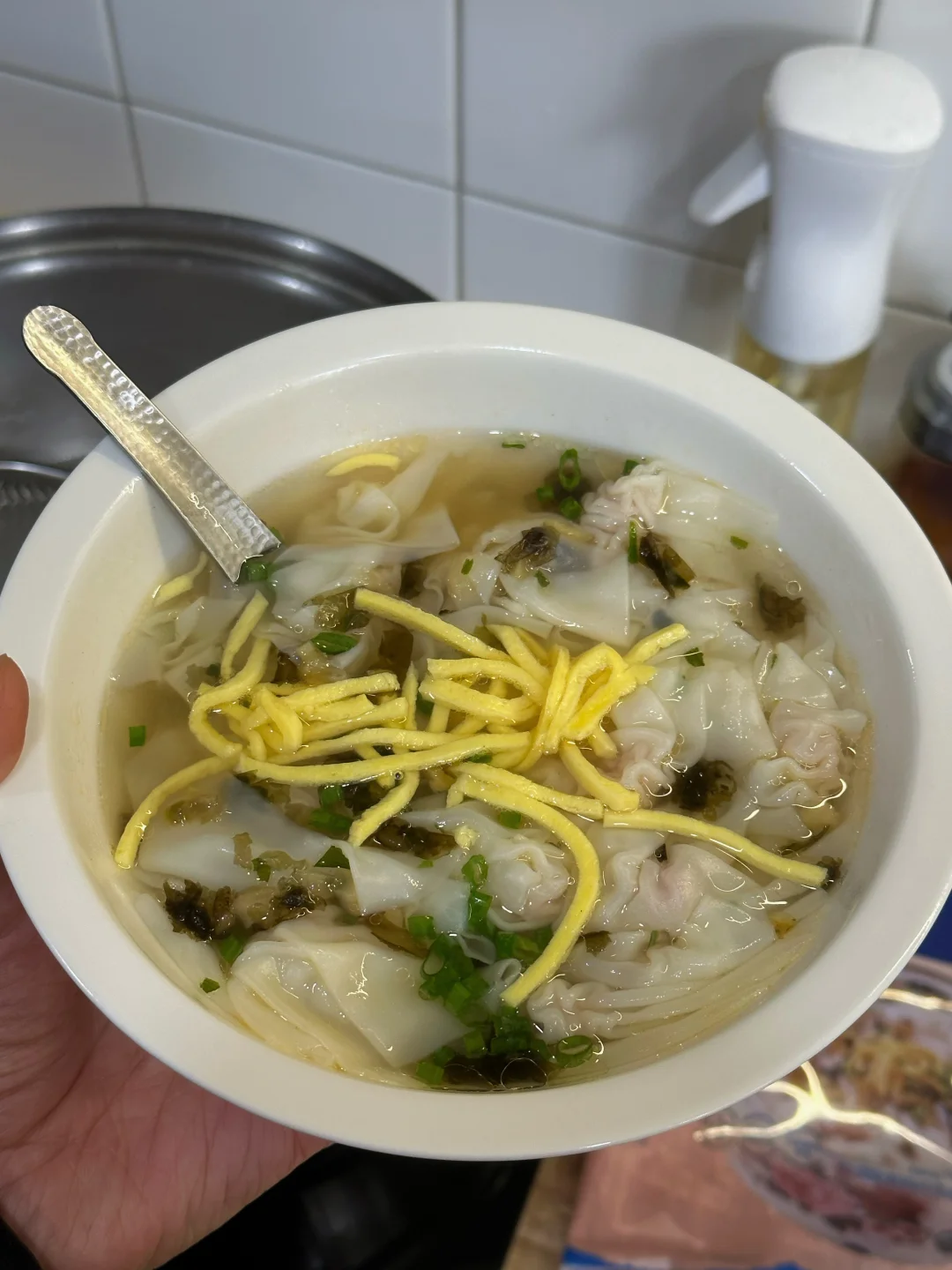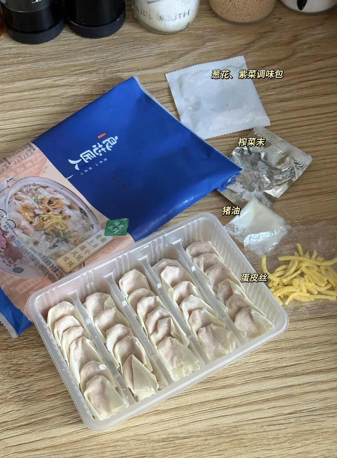 里面料包超实在,榨菜碎、独立猪油包、蛋皮丝、紫菜葱花配齐,无需额外加料。手工包制冷鲜馄饨,皮馅贴合紧实,下锅5分钟就能吃!而且粉嫩猪腿肉馅弹嫩无腥,薄皮滑爽细腻,一小块猪油放入汤中,香鲜味瞬间迸发,妥妥弄堂里的老式味道,朴实又扎实!