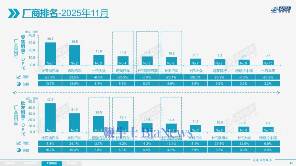11月新能源乘用车企业总体走势较强,比亚迪纯电动与插混双驱动夯实自主品牌新能源领先地位。