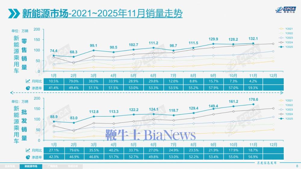 11月新能源乘用车市场零售132.1万辆,同比增长4.2%,环比增长3.0%;1-11月累计零售1,147.2万辆,增长19.6%。