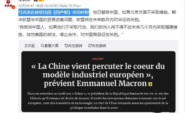 马克龙回去就变了吗? 12月8日,有知名军事博主晒出马克龙的一段发言,也就是国外媒体《回声报》采访马克龙的一段话,当然了国外媒体有时候也不靠谱,还有一种可能就是马克龙回去后,故意这样说是来迎合他们这些右翼人员的,很多网友看到后都感觉不可思议,也体会到马克龙善变的本性。随后引起了很多网友的热议,马克龙在这个文案中是大概是这样说的,也就是我们不解决欧盟与中国的贸易逆差问题,欧盟将在未来数月內对华征收关税。也要学美国那样。 截止到目前为止,马克龙本人没有任何这方面的回应,说不定是这些媒体故意挑拨离间,所以我们暂时还不能相信,毕竟西方这些媒体比马克龙坏的多。他们自己不好也不想让别人好起来。 不管怎么样,什么事情都不能靠国外,打铁还需自身硬。只由自己强大起来,说什么做什么都是对的。要是自己不够厉害,你越对他们好,估计他们就越想欺负你。