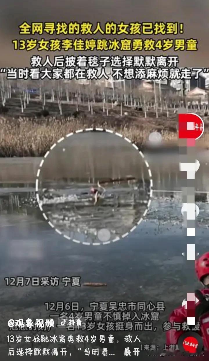 冰窟救人的女孩,好样的 大冬天湿透了,做了见义勇为的好事,却不当一回事,懂事得让人心疼。 这个叫李佳婷的13岁姑娘,骨子里藏着远超年龄的勇敢。4岁男童掉冰窟的那一刻,谁能想到,一个才刚上初中的小姑娘,没有半点犹豫就冲了上去!脚下的冰面踩上去咯吱作响,稍不留意就可能跟着滑进刺骨的水里,她却顾不上这些,扑到冰窟边就伸手去抓男童冻得发紫的小手,指尖碰到冰碴子的瞬间钻心的疼,可她半点没松劲,咬着牙一点点把孩子往岸上拉。 孩子救上来的时候,把孩子交给家长之后,李佳婷浑身的棉袄早被冰水浸透她披着毯子选择默默离开,冷风一吹冻得她嘴唇发颤,知后经过男童家长多方打探找到勇敢的女孩叫李佳婷,男童家长提着厚礼上门道谢,她还躲在父母身后不好意思露头,说就是帮个忙而已,换别人看到也会救的。你看这孩子,拼尽全力救人的时候没怕过,面对感谢却羞得脸红,这份不掺半点功利心的善良,比任何华丽的夸奖都更戳人心。 更难得的是,她做这一切的时候,根本没考虑过自己会不会受伤,会不会被冻坏,满脑子就只有赶紧把孩子救上来。这种纯粹的见义勇为,比那些喊着口号却遇事退缩的人,不知道强了多少倍。父母肯定在她成长里种下了善良的种子,可最终让种子发芽开花的,是她自己愿意把这份善意变成行动,这份自觉比任何刻意的教育都更有力量。 这样懂事又勇敢的姑娘,真该让更多人知道!她用小小的身躯点亮了温暖,也给所有人上了一课——真正的勇敢,是明知有危险还愿意挺身而出;真正的善良,是做了好事却不求回报。为李佳婷点赞,也希望这样的好孩子能被世界温柔以待,更希望这份纯粹的善意,能传递给更多人。