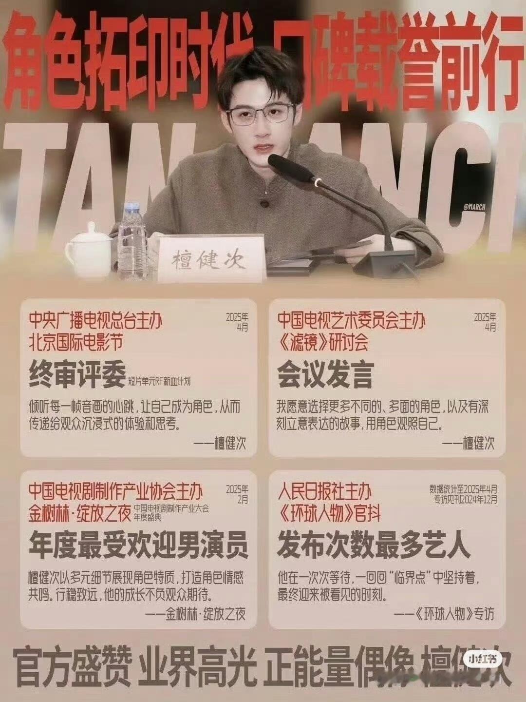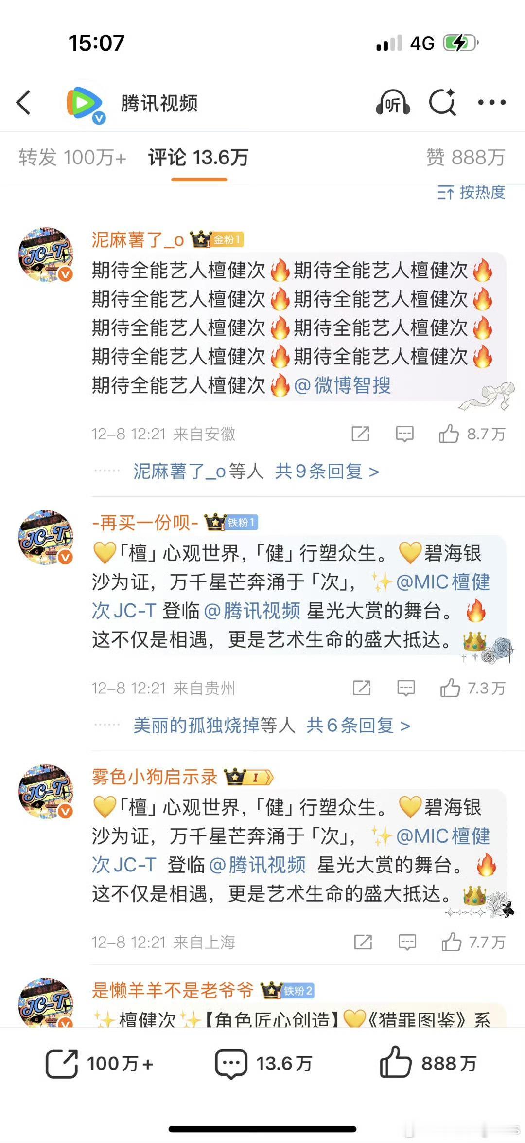 腾讯视频发布星光大赏阵容官宣 战报,官宣10分钟微博指数破8000万,评论区前排几乎都被檀健次粉丝占了,小炭火行动力太强了! 檀健次今年一共播了两部剧,都进入了腾讯拉新榜,是唯一两部剧都在拉新榜的艺人,另外这两部剧同时都入选了广电的优秀网络视听剧集,真正的高品质高流量,优质演员檀健次! 这个十二月吃这么好,接下来就让我们燥候12.21,期待和唐奇沈翊在海口再多见一次啦!!