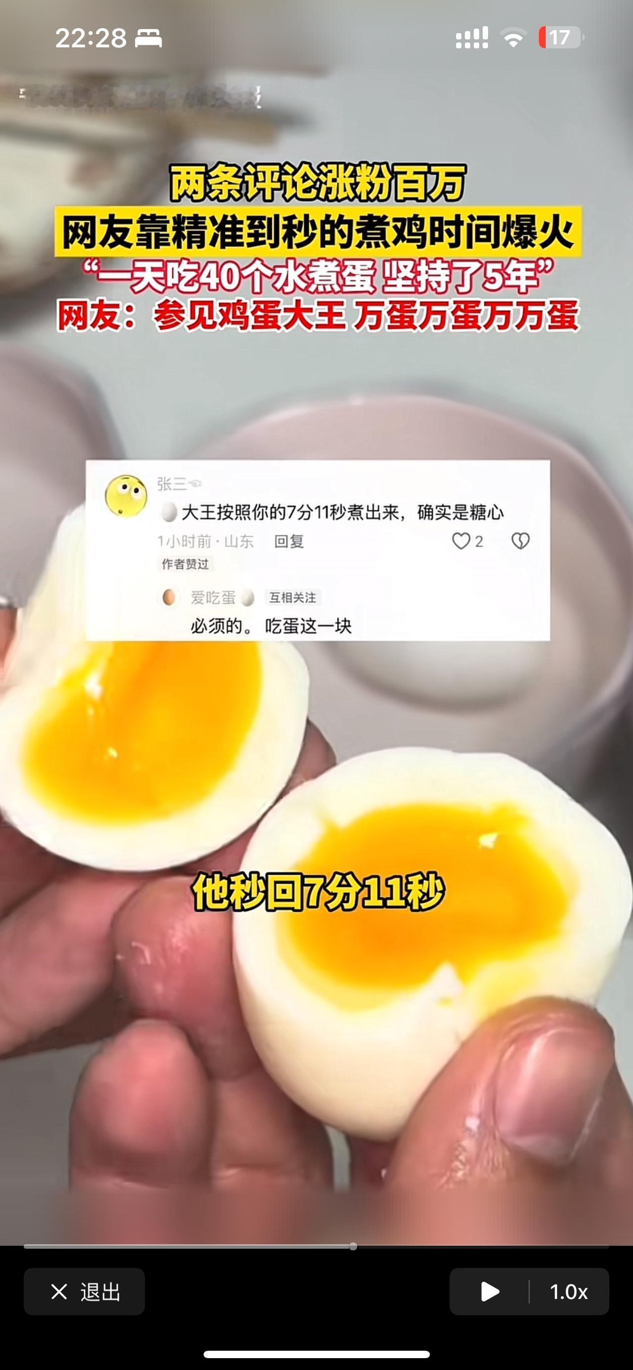 两条评论涨粉百万,小伙靠精准到秒的煮蛋时间爆火,被央视转发,网友直呼他鸡蛋大王。起因是一网友分享爸爸煮的神仙鸡蛋。评论区一位叫爱吃蛋的小伙精准给出秘方,水开下蛋9分12秒捞出过凉水,有人追问溏心蛋怎么做,他秒回7分11秒,引得网友掐秒尝试,都成功煮出完美鸡蛋。他说自己一天要吃40个水煮蛋,连续吃了5年,对每一秒的火候都了如指掌,鸡蛋大王就此走红,被央视转发4天涨粉185万