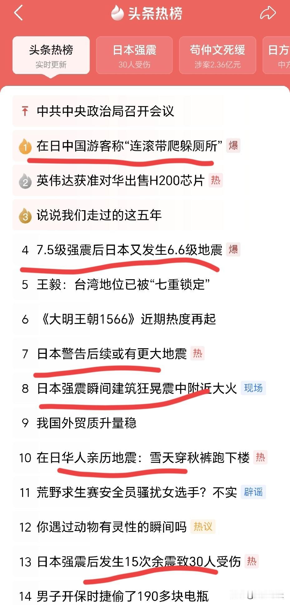 为什么各大平台热搜都是日本地震? 以头条最夸张,头条热搜前15条占了6条,超三成