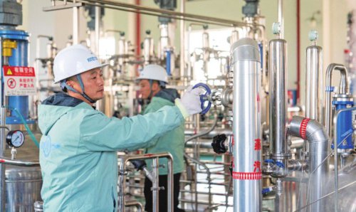 近年来,湖南省常德市津市市大力发展生物制造产业,拥有生物制造骨干企业27家,成为全国重要的酶制剂、甾体原料药和医药中间体生产出口基地。图为津市高新区一企业内,工作人员进行种子罐蒸汽消毒作业。新华社