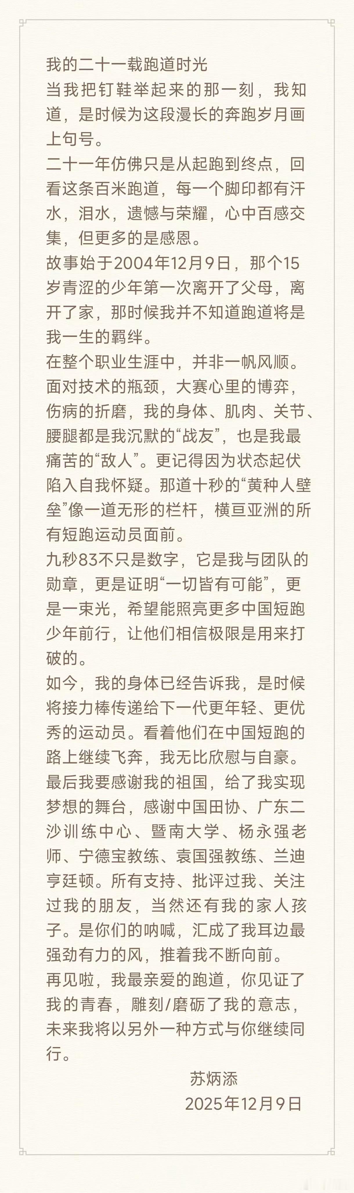苏炳添退役苏炳添发长文宣布退役 9日,男子100米亚洲纪录保持者、中国短跑名将发长文宣布退役。他在文中回顾了21年的跑道时光,“如今,我的身体已经告诉我,是时候将接力棒传递给下一代更年轻、更优秀的运动员”。