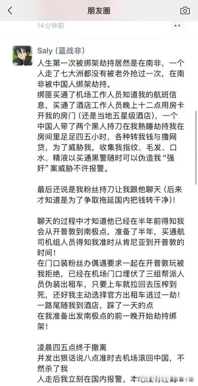 蓝战非在南非绑架一事,至少给大众3个忠告! 第一,要低调,不要炫富,否则很容易被人盯上; 第二,外出不要去不安全的国家或地区; 第三,要注重个人隐私,不要提前透露私人行程; 蓝战非高调,说一年赚10亿是小瞧他了,然后被人盯上;然后又直播时透露自己的旅行计划,让对方有时间提前筹划;最后是他去了一个极其不安全的国家南非,最终让犯罪分子有机会实施计划。
