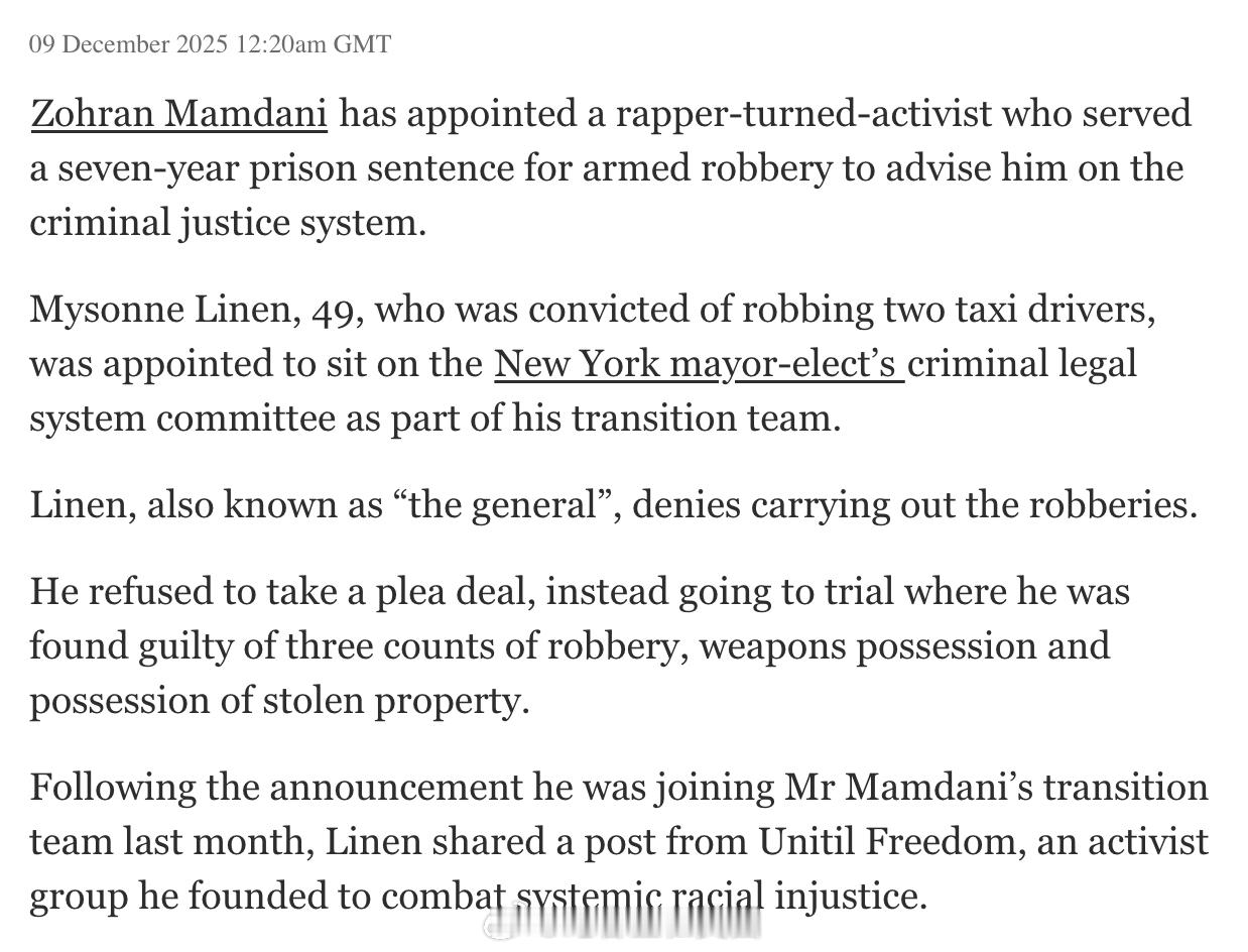 新纽约市长Zohran Mamdani任命说唱歌手Mysonne Linen在其过渡期的刑事司法委员会任职。这项任命引发争议,因为49岁的Mysonne Linen于1999年7月被判两项持枪抢劫罪名成立,检方指控他参与了1997年至1998年间针对纽约市出租车司机的系列抢劫案,最终被判7年监禁。但Linen一直坚称自己无辜,表示并未实施这些犯罪 。另外,Mamdani公布的委员会名单中,还把Mysonne Linen的名字拼错成了“Mysoone”。今日焦点海外新鲜事