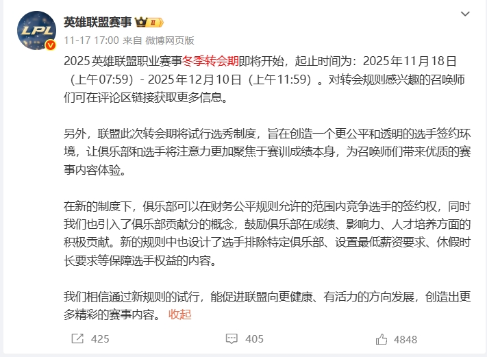2025英雄联盟职业赛事冬季转会期起止时间为:2025年11月18日(上午07:59)-2025年12月10日(上午11:59)。
