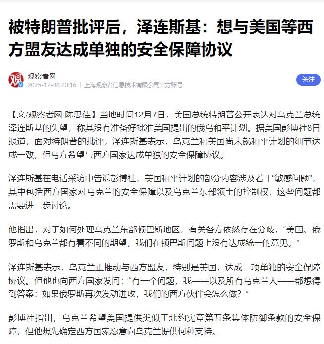 乌克兰必败无疑?被特朗普批评后,泽连斯基慌了!急忙做出让步! 其实发展到这个地步,俄乌局势已经很明了了。据媒体12月8日报道,最近特朗普公开说对泽连斯基失望,还说他连美国提的“和平计划”都没读,暗示是他在拦着和谈。 这番批评可把泽连斯基急坏了,没过多久,他接受彭博社采访时就明说,要跟美国这些西方盟友签个单独的安全保障协议,还直愣愣地问:“要是俄罗斯再打过来,你们西方伙伴到底会怎么做?” 明眼人都能看出来,这不是泽连斯基一时兴起,是被特朗普批了之后,加上自己现在处境太难,没辙才想出来的办法,也是为了保住乌克兰当下的局面必须做的事。 要明白泽连斯基为啥这么急,先得搞懂特朗普这批评背后的意思。这些年乌克兰能在战场上撑着,全靠美国和西方盟友给钱给武器。 数据显示,从2022年到现在,美国给乌克兰的援助都147.8亿美元了,像“海马斯”火箭炮、“爱国者”防空系统这些能挡住俄军的关键装备,全是美国给的。 可特朗普政府对乌克兰的态度早就变了,2025年1月先停了几乎所有援助,后来恢复一点,3月又把军援冻在波兰,不让运。 特朗普还明说,美国不直接给钱了,乌克兰要武器就找北约,美国只跟北约做买卖。现在又批评泽连斯基拦和谈,说白了就是施压:要么听我的推进和谈,要么就彻底断你援助。 泽连斯基心里门儿清,美国一旦彻底断援,乌克兰撑不了几天。现在战场情况本来就差,乌军死伤多,还有逃兵不愿打仗,很多新兵没练几天就上战场。 反观俄罗斯,人多兵源足,还有1.2万名朝鲜士兵帮忙,就算新兵练得不够,靠人多也能压着打。 更关键的是,乌克兰的弹药也就够高强度打几个月,美国不补,欧洲盟友也顶不上,欧洲军工产能有限,三年才给620亿欧元援助,跟美国差远了。 所以泽连斯基才急着要份实打实的安全协议,把美国绑死,就算以后特朗普想断援,也有协议管着。 有人会问,为啥非要“单独”的协议?看看美国和沙特就知道了,2025年11月特朗普政府刚跟沙特签了安全协议,把沙特当成重要盟友,给顶级安保承诺,卖先进武器还答应安全兜底。 泽连斯基就是想抄这个作业,要一份只针对乌克兰的明确保障,之前靠北约这些多边机制,西方承诺都说得模棱两可,真出事了未必管用。 他问西方“俄罗斯再打过来咋办”,就是要个准话:真打起来,你们会不会像帮沙特那样,真出兵或者给够武器? 另外,顿巴斯地区的控制权问题也绕不开,泽连斯基自己也说,美俄乌三方想法不一样。 特朗普推的“和平计划”,大概率是想让乌克兰在领土上让步,可泽连斯基要是答应了,国内民众肯定不答应。 所以他要安全协议,也是想在领土谈判里多拿点筹码:有了美国的单独保障,就算在顿巴斯让一步,也能跟国内说“是换安全”;要是没这份保障,让了领土又没安全承诺,乌克兰就真成软柿子了。 说白了,泽连斯基现在就是在赌,赌美国不敢真放弃乌克兰。毕竟俄乌打了这么久,美国投了上百亿美元,真放手的话,之前的钱全白花,还会让其他盟友觉得美国不靠谱。 但特朗普政府只认利益,说断援就断援,2025年2月泽连斯基去白宫,还跟特朗普吵了一架,被怼得没话说提前走了。这种情况下,泽连斯基不敢赌,只能主动要协议,把美国的责任定下来。 可这想法实现起来太难了。特朗普早就说过,美国只帮衬不主导,要欧洲派几万兵,美国才给支持,还坚决不派美军去乌克兰。 欧洲国家本来就不想派兵,就算想帮也没这能力。更重要的是,美国想尽快结束冲突少花钱,泽连斯基要的是不打折扣的安全保障,这俩想法根本拧不到一起。 总的来说,泽连斯基被特朗普批了之后急着要单独安全协议,核心就是怕美国断援、怕领土谈判吃亏、怕乌克兰没安全保障。 他拿美沙协议当例子,用战场困境施压,就是想让美国给个明确的、不能反悔的承诺。 但在特朗普的利益算计和欧洲的犹豫观望下,这协议能不能签成、签了算不算数,都是未知数。 泽连斯基的焦虑和无奈,说到底就是小国在大国博弈里由不得自己,想靠别人保护求生存,从来都是难上加难。