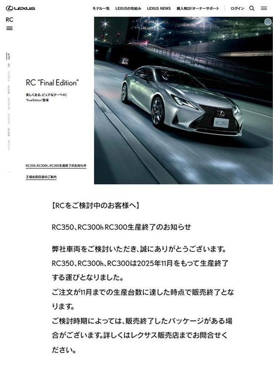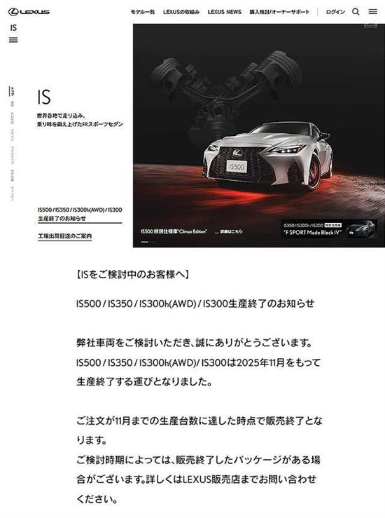 日前,车质网从日本雷克萨斯官方获悉,日规版的雷克萨斯IS车系、RC车系部分动力车型、雷克萨斯UX 300e即将会在2025年11月在日本当地停售停产,现阶段启动“售完为止”的模式销售。另外,全新雷克萨斯IS将会在2026年亮相,并有望国产化。