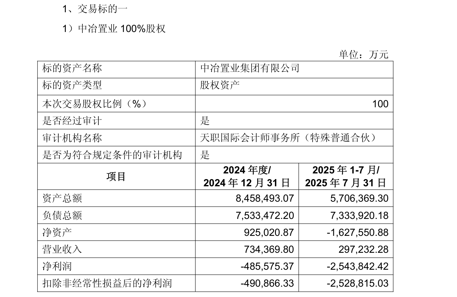 今年,中冶置业业绩继续下行。据资产评估报告,今年1-7月,中冶置业营收29.72亿元,净利润为-254.38亿元。
