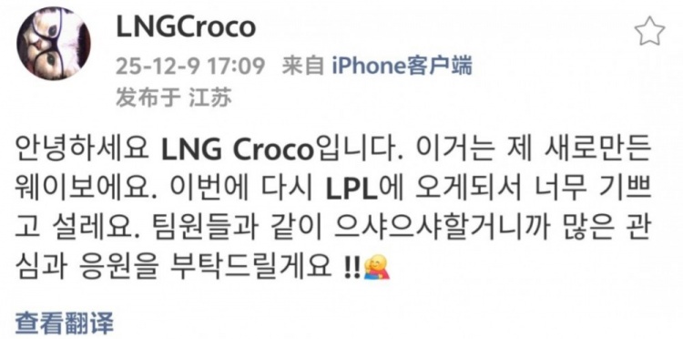大家好我是LNG的Croco,这是我的新微博,很开心再次来到LPL,我会努力和新队友们一起加油,希望大家多多支持我!