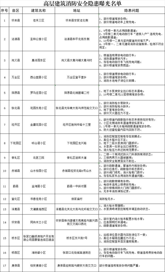 为进一步净化全市高层建筑消防安全环境,充分发挥媒体和社会监督舆论作用,促进火灾隐患的整改,维护全市消防安全形势稳定,张家口市消防救援支队曝光17家高层建筑火灾隐患单位,名单如下: