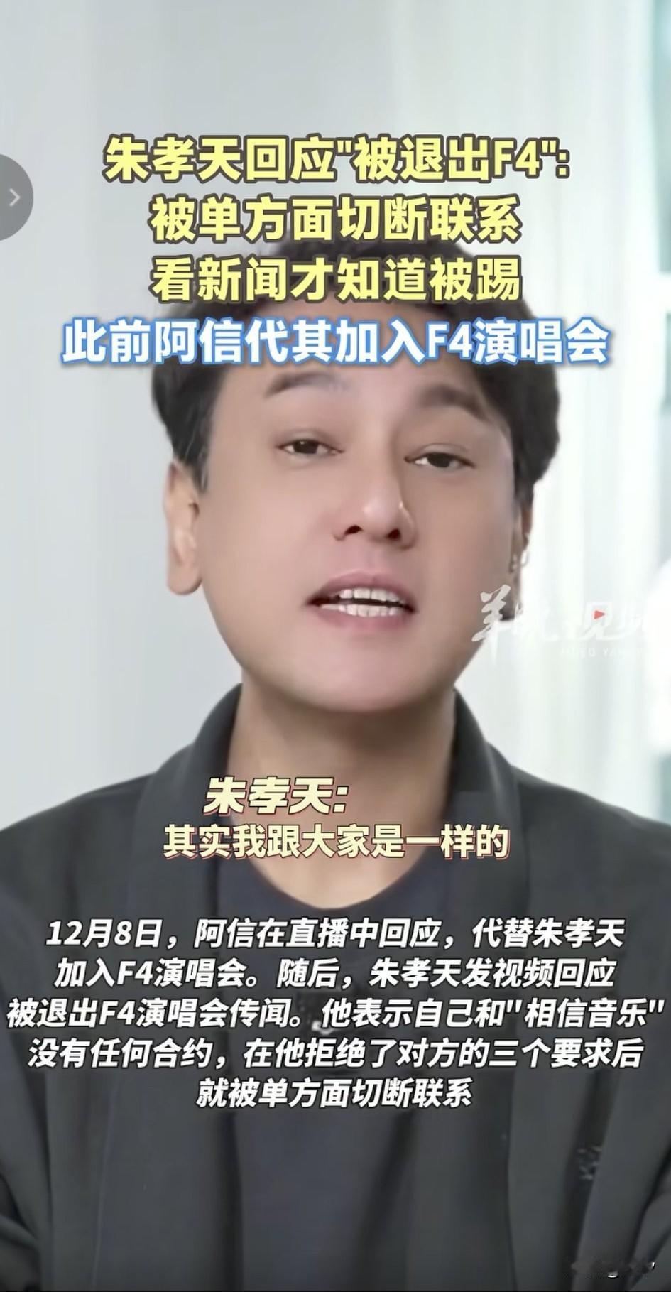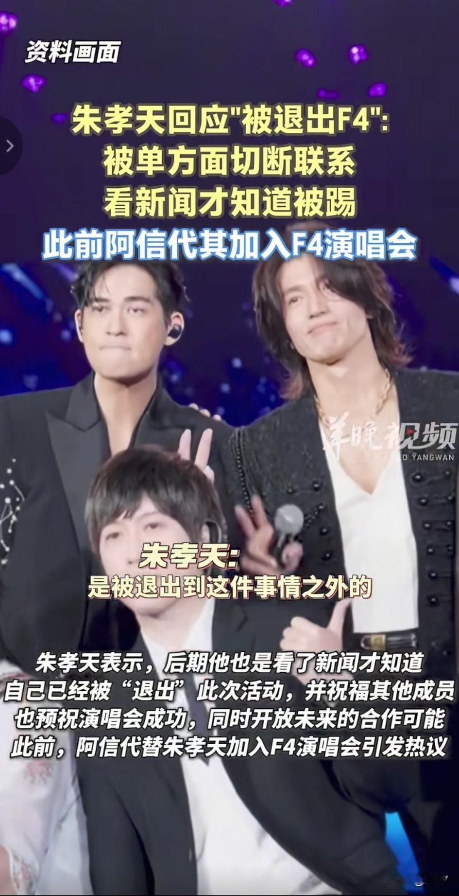 F4朱孝天回应了, 自己被相信音乐公司踢出局了, 自己和大家也是看了新闻才知道, 本来他开开心心的要参加F4的重聚, 他的妻子表示他为此减肥瘦了30斤, 只是因为拒绝了三个要求, 结果就被踢出局, 网上出现了对他的谩骂, 他表示是对方不沟通单方面与他断了联系,他和相信音乐公司没有任何合约, 本来是一场好好的F4聚首, 如今阿信代他加入了F4, 并在上海开启了巡回演唱会, 唱了由周杰伦他们创作的歌曲, 据此前的报道, 可能是因为朱孝天在直播中为了人气, 经常泄露演唱会的人员和细节, 于是被公司认为是不可控因素, 这才直接和他断了联系将他踢出局, 粉丝们以为的兄弟情, 实际上只不过是资本组的局, 就是方便收割粉丝而已, 如今这个泡沫被戳破了, 真相让人难以接受, 大家对于朱孝天被退出F4怎么看? 上海身边事 娱乐圈那点儿事 周杰伦最美的一句歌词是什么 阿信 言承旭 朱孝天 流星花园 韩雯雯回应朱孝天被退出F4