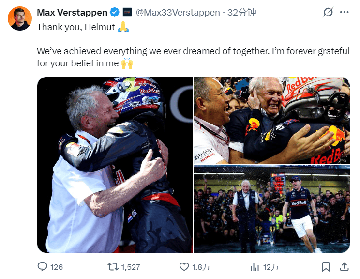 荷兰车手写道:“谢谢你,赫尔穆特!我们携手实现了曾经梦寐以求的一切。对于你一直以来对我的信任,我永远心怀感恩。”