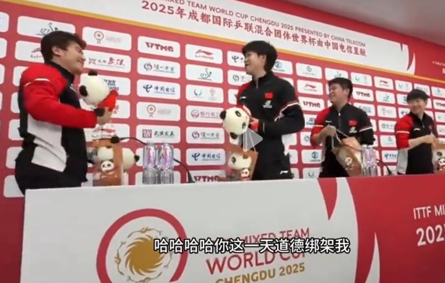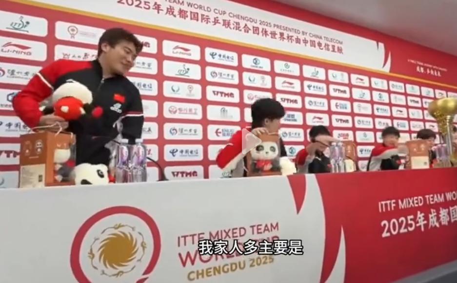 国乒成都夺冠后,在记者会上,梁靖崑的面前比别人多摆了一只熊猫玩具,这是他从王楚钦那儿“顺”来的,发布会结束后,当确认玩具可以拿走后,他大包小裹地准备一起带走,还和王楚钦解释一句:我家人口多!王楚钦也很无奈,笑着说:你这是道德绑架我!也确实是,梁靖崑有媳妇还有俩孩子,加上队友周雨的女儿也管他叫爸,拿少了确实不够分[捂脸]