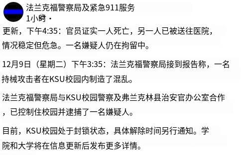 最新通报:警方称,肯塔基州立大学发生枪击事件,造成1人死亡、1人重伤。