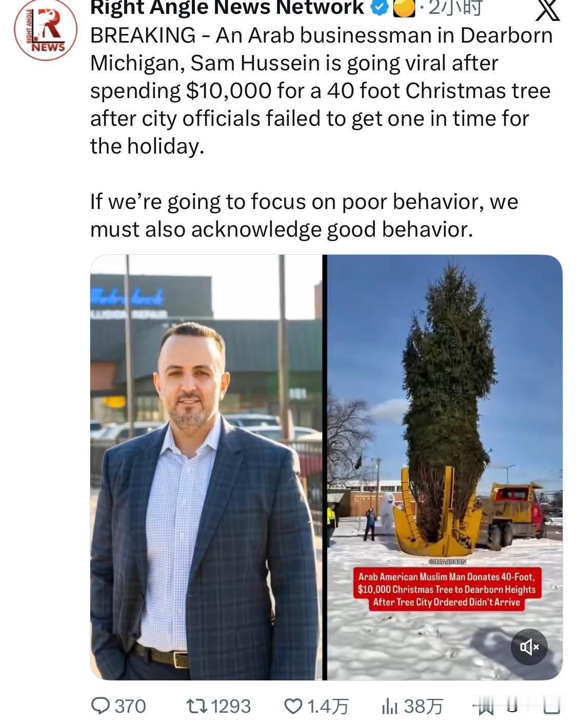 突发新闻——美国密歇根州迪尔伯恩市的一位阿拉伯商人萨姆·侯赛因和当地一家农场Huff's Tree Farm合作花费 1 万美元购买了一棵 40 英尺高的圣诞树,因为市政府官员未能及时为节日准备一棵圣诞树,此事在网上迅速传播开来。 当地商人萨姆·侯赛因和密歇根州一家树木农场的老板联手支付了迪尔伯恩高地市政厅一棵价值 1 万美元的圣诞树的费用,因为该市最初的人造圣诞树被延误了。 侯赛因是 J&T Crova 的所有者,而农场是位于密歇根州高地的 Huff's Tree Farm。 迪尔伯恩高地市原先由上一届政府订购的人造圣诞树,由于关税和其他问题,运输途中受阻,这意味着它无法及时送达,赶上计划中的点灯仪式。 市政府必须在取消活动和尽快找到替代方案之间做出选择。 萨姆·侯赛因和赫夫树木农场的合伙人之一尼古拉斯·赫夫伸出了援手。市政府代表联系了农场,农场提供了一棵40英尺高的挪威云杉。 赫夫树木农场支付了这棵树约 10,000 美元成本的一部分,商人萨姆·侯赛因支付了其余部分。 动机:侯赛因是一位阿拉伯裔美国穆斯林商人,他表示,帮助社区团结并确保家庭能够继续享受这个备受喜爱的节日庆典,“我认为这是应该做的”。尼古拉斯·赫夫也对在节日期间帮助社区表示自豪。 新树已成功运抵并及时安装在市政厅前,以迎接仪式的举行,希望这能成为一项长久的传统。