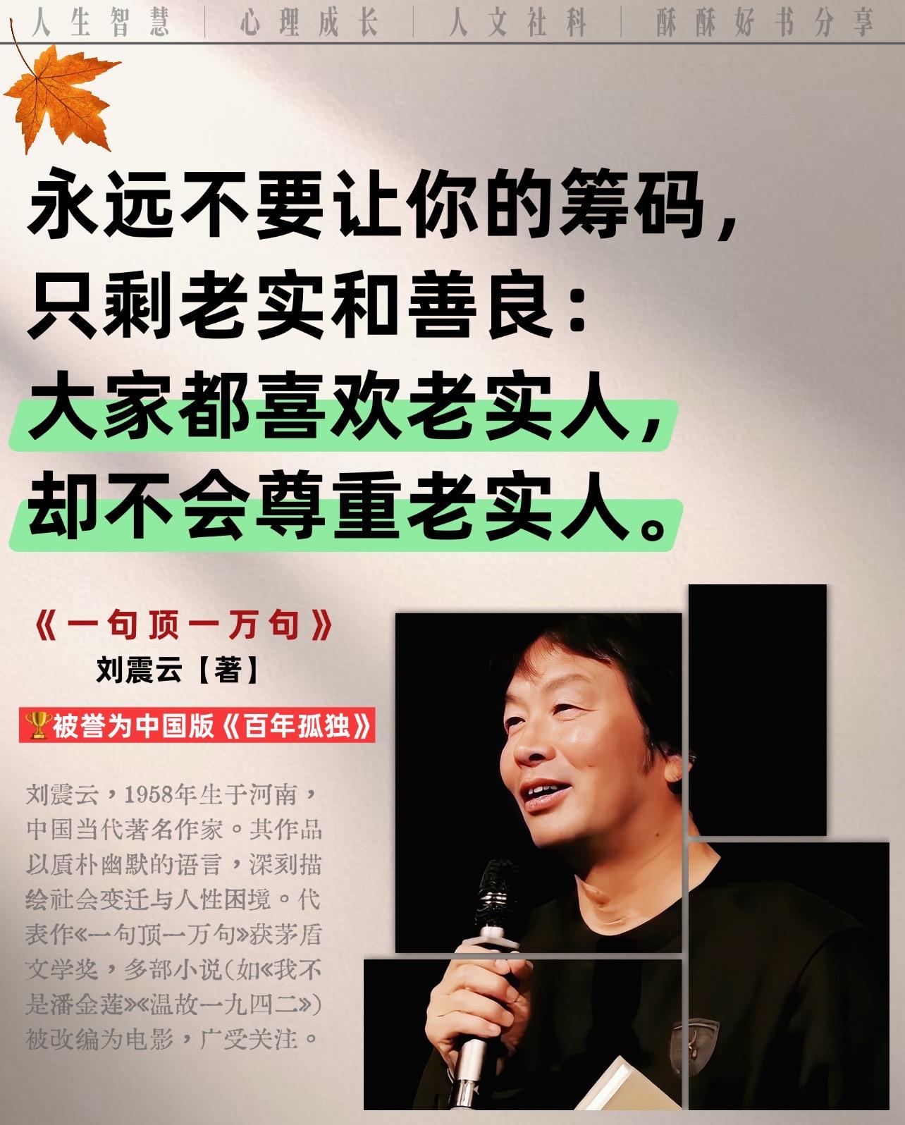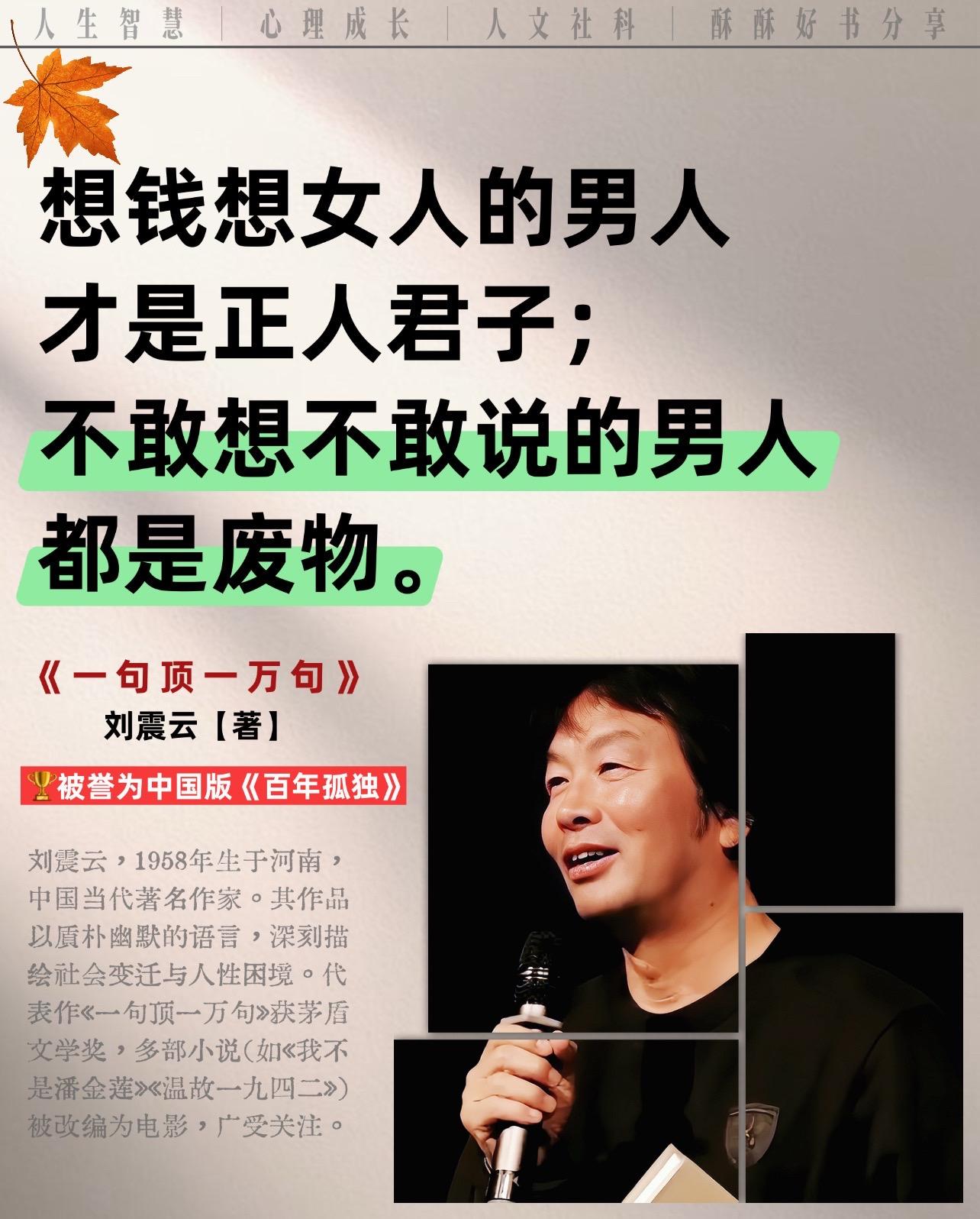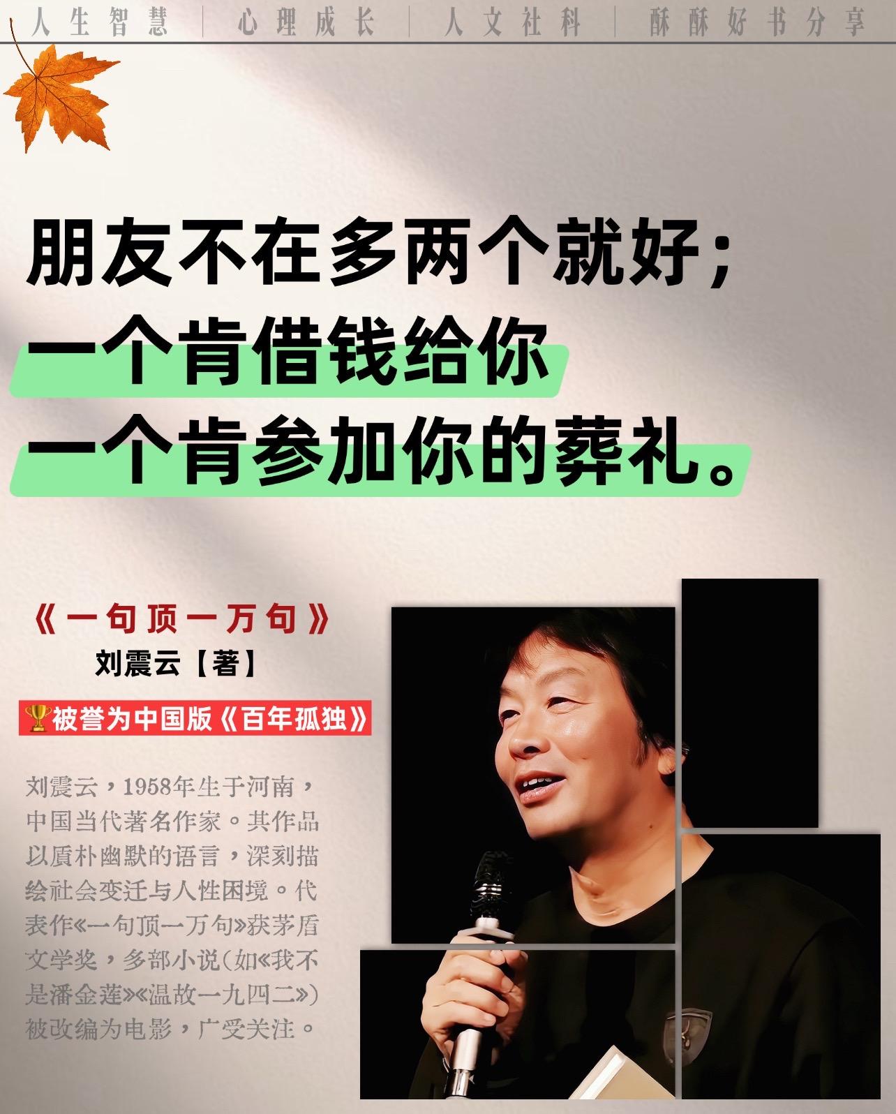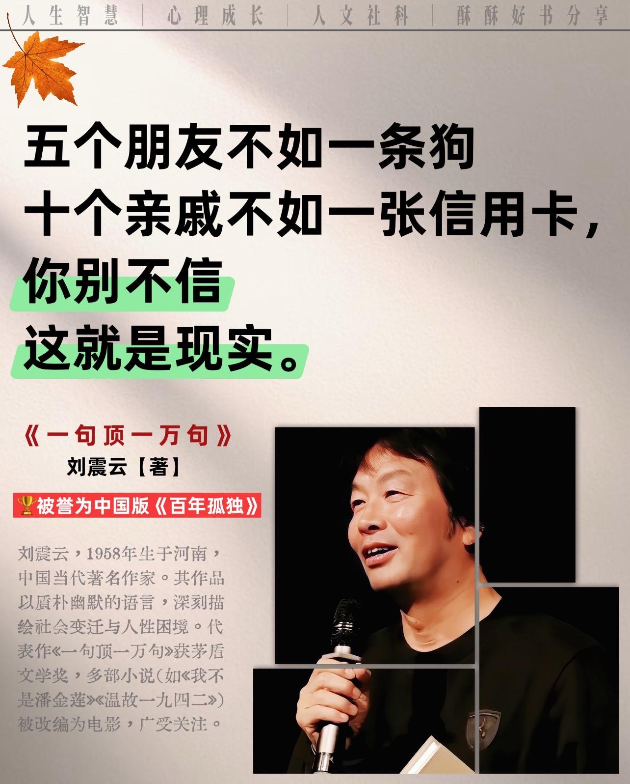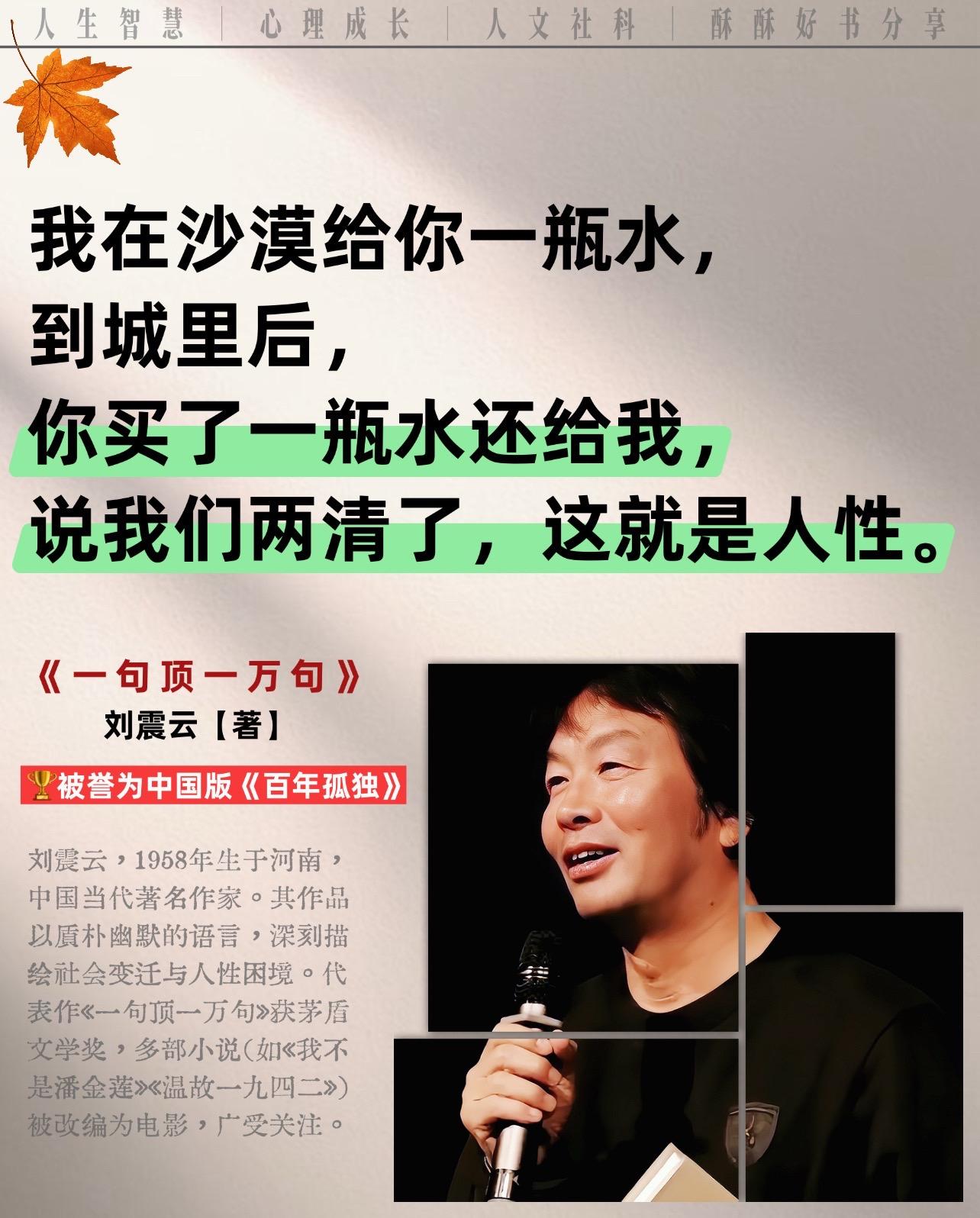 刘震云封神之作《一句顶一万句》!读它像被温柔裹住,人性刻画通透到骨子里。 沉浸其中恰似一场澄澈的精神抚慰,对人性底色的洞察如琉璃般透亮。鲜活故事肌理下,藏着言语力量与沟通困境的深邃哲思,笔触冷峻却裹着悲悯,于细腻处写尽灵魂的孤独重量。 书中字句如银针入穴,精准刺破人性幽微与生存无奈,读来灵魂激荡、共鸣如潮。它既是对言语之光的礼赞,更是对沟通壁垒的深沉省思,堪称值得反复品读、常读常新的生命之书!