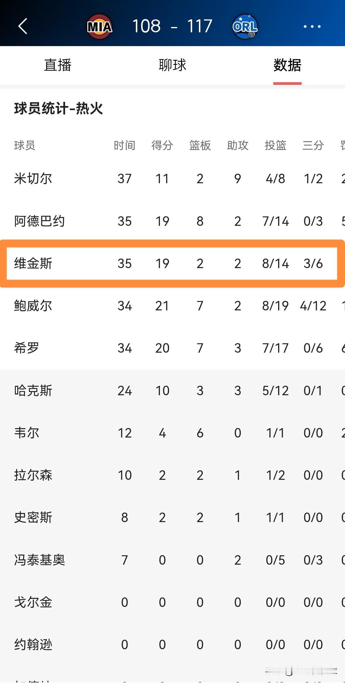 恭喜热火大将维金斯超额完成任务!虽然今天热火在客场以108:117输给了魔术,无缘NBA杯的半决赛,但是维金斯的得分却超过了自己的赛季场均得分。 全场比赛下来,维金斯首发出战35分钟,投篮14中8,其中三分球6中3得到19分2篮板2助攻1抢断1盖帽,他的场上正负值为+7。 值得一提的是,本赛季维金斯的场均得分为16.8分,而今天维金斯怒摔保温杯砍下19分。