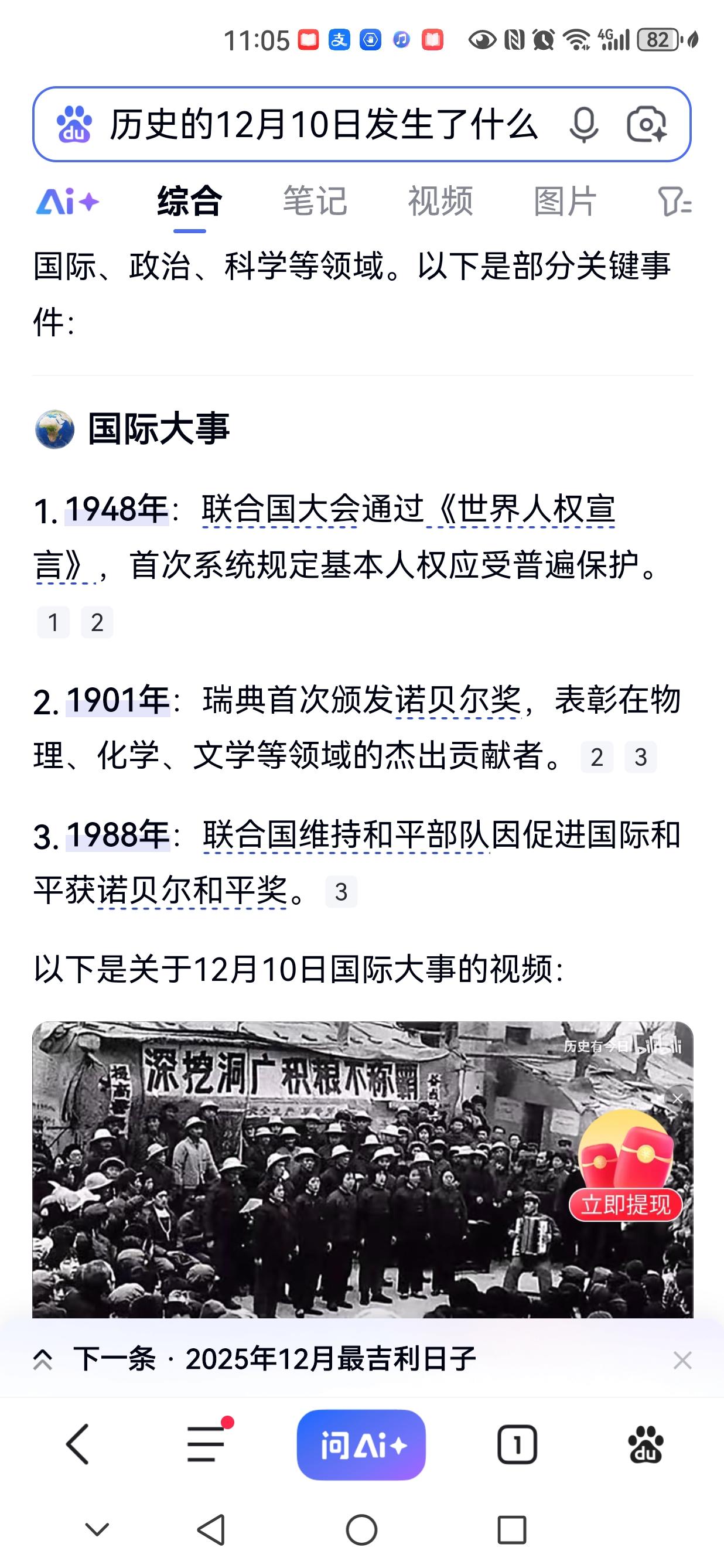 1948年12月10日,联合国大会通过《世界人权宣言》; 1901年12月10日,瑞典首次颁发物理、化学、文学等方面的诺贝尔奖项; 1988年12月10日,联合国维和部队过诺贝尔和平奖。 1948年12月10日,毛泽东、朱德电贺何基沣、张克侠起义加入解放军; 1977年12月10日,中断11年的中国高考得以恢复,打开中国高考的新局面。