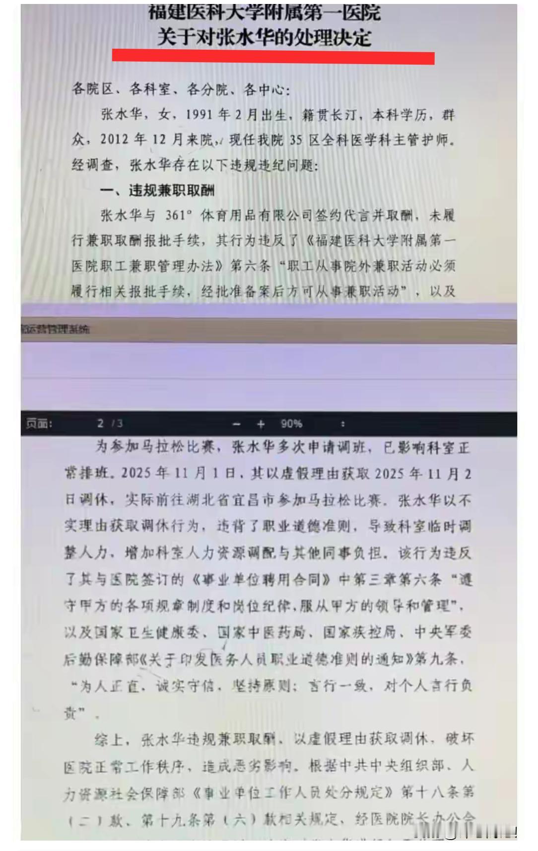 “最快女护士”张水华,近50天密集参加5场马拉松,在收获超22万元奖金的同时,也收到医院处分! 先看看医院处分的理由:第一个是违规兼职赚取报酬,第二个是以虚假理由获得调休,影响医院正常工作秩序。我还是很支持医院的做法!无规矩,不成方圆。张水华成为“名人”后,也不能为所欲为,毕竟还在事业单位上班,还得遵守单位的各项规章制度。 8月份,女护士张水华在哈尔滨马拉松比赛获国内女子组冠军,赛后哭诉“望领导支持调休跑马拉松”,持续引发关注。得了便宜还卖乖,没有感恩,只有抱怨。老是调休,已经影响其他同事的休息。医院护士就那么几个,本来你周末值班,别人休息。你一调休周末不值班,别人就得值班没得休息,让其他同事承担额外的工作负担。最近50天就跑了5趟马拉松,那一年多少次?又得调休多少次?影响其他同事多少次?仔细想想,是不是精利主义者?只想着领导支持她调休,没有去想多少同事为了她调休牺牲多少个周末?