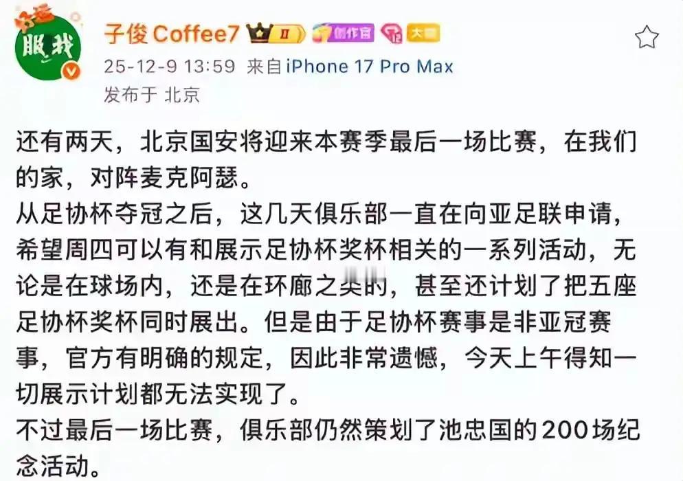 实在太遗憾了!亚足联驳回了北京国安的请求,球迷们倍感失望。在足协杯决赛里,北京国安击败河南队,历史上第五次捧起足协杯冠军奖杯。为答谢球迷,与球迷共同庆祝,夺冠之后,北京国安俱乐部向亚足联提出申请,希望能在12月12日亚冠二级赛事主场展示足协杯冠军奖杯。 我想去义乌订一个世界冠军杯 奥运会冠军杯送给他们[赞] 国安是在告诉亚冠二级,老子是足协杯冠军,老子下赛季是进亚冠一级精英联赛。 国内赛事奖杯拿到国际上展示,显示自己有多强吗?有本事就到国际赛场去夺吧! 我明白了,是因为客场捧杯,球迷还没见到奖杯,问题这还用跟亚足联申请吗,比赛结束后球迷留一下,展示不就是。 比赛前不行,比赛中不行,比赛结束退场后,你想搞啥幺蛾子,他管不了啊。只是比赛赢了还好,要是输了,有点不好好意思庆祝了。 北京国安一个足协杯冠军,在国内庆祝,还闹腾去亚冠赛场上展示奖杯,真有这事吗?