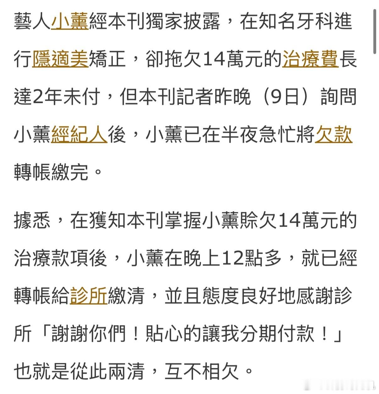 据台媒,小熏已在昨晚缴清牙齿欠款
