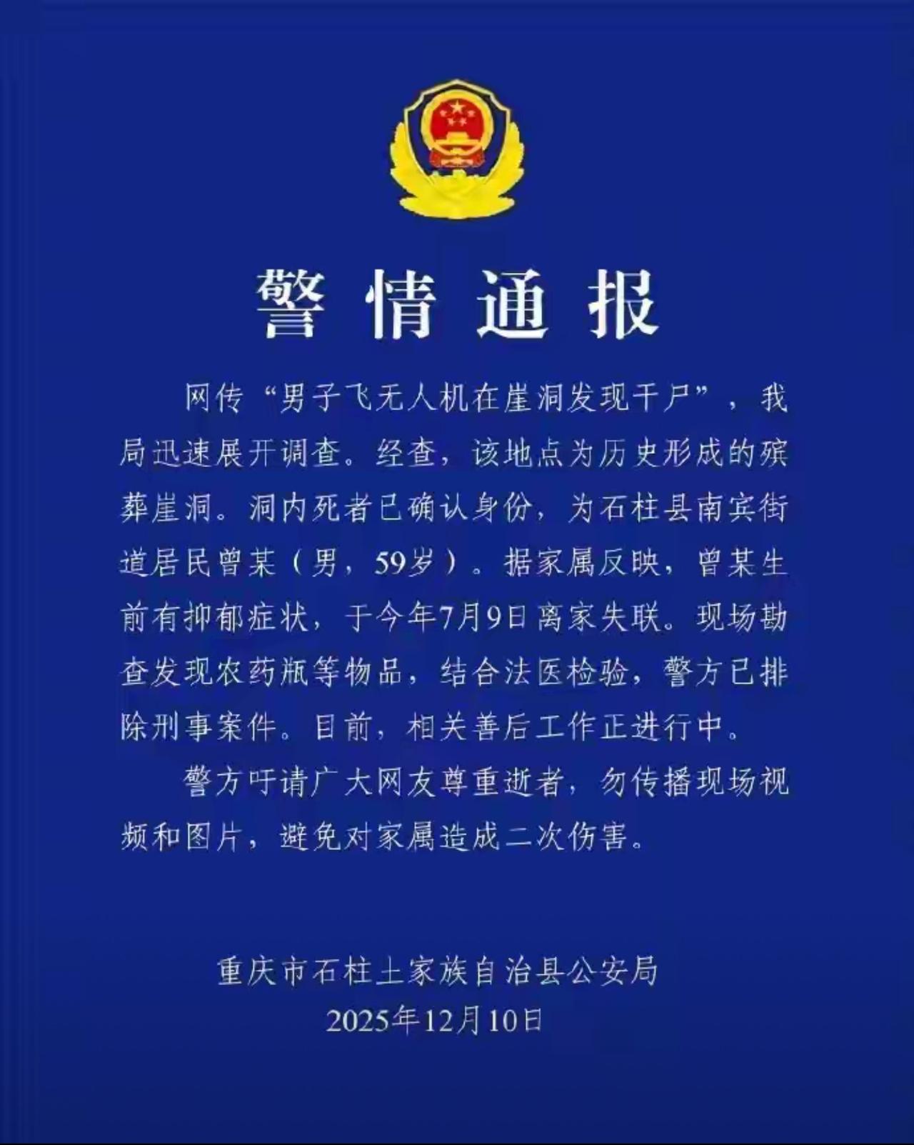 重庆崖洞干尸的谜底终于揭开了,结果一出,好多人都跟着叹气! 警方通报实锤:死者是石柱县59岁的曾某,今年7月就因抑郁症离家失联,家属当时急疯了,报警、寻人折腾了四个月,愣是没半点音讯。 谁能料到,他竟是揣着农药瓶、裹着毛毯,独自爬到偏僻崖洞,选择了这样一条绝路!法医检测出体内农药残留,结合现场物证,直接排除他杀,定性为抑郁症自杀。 最暖心的是,要不是那位无人机网友拍下视频发到网上,曾某可能至今还长眠在荒山野岭里。他的女儿刷到视频后立刻联系,终于找到了父亲,还特意发声感谢这位素不相识的网友。 想想就揪心,他大概是怕拖累子女,才悄无声息地躲起来……四个月里,家属该是熬了多少个不眠夜啊! 真心为这位网友点赞!一个无心之举,帮逝者入土为安,也让一个家庭了却了最大的遗憾! 人的一生最大的财富是什么?